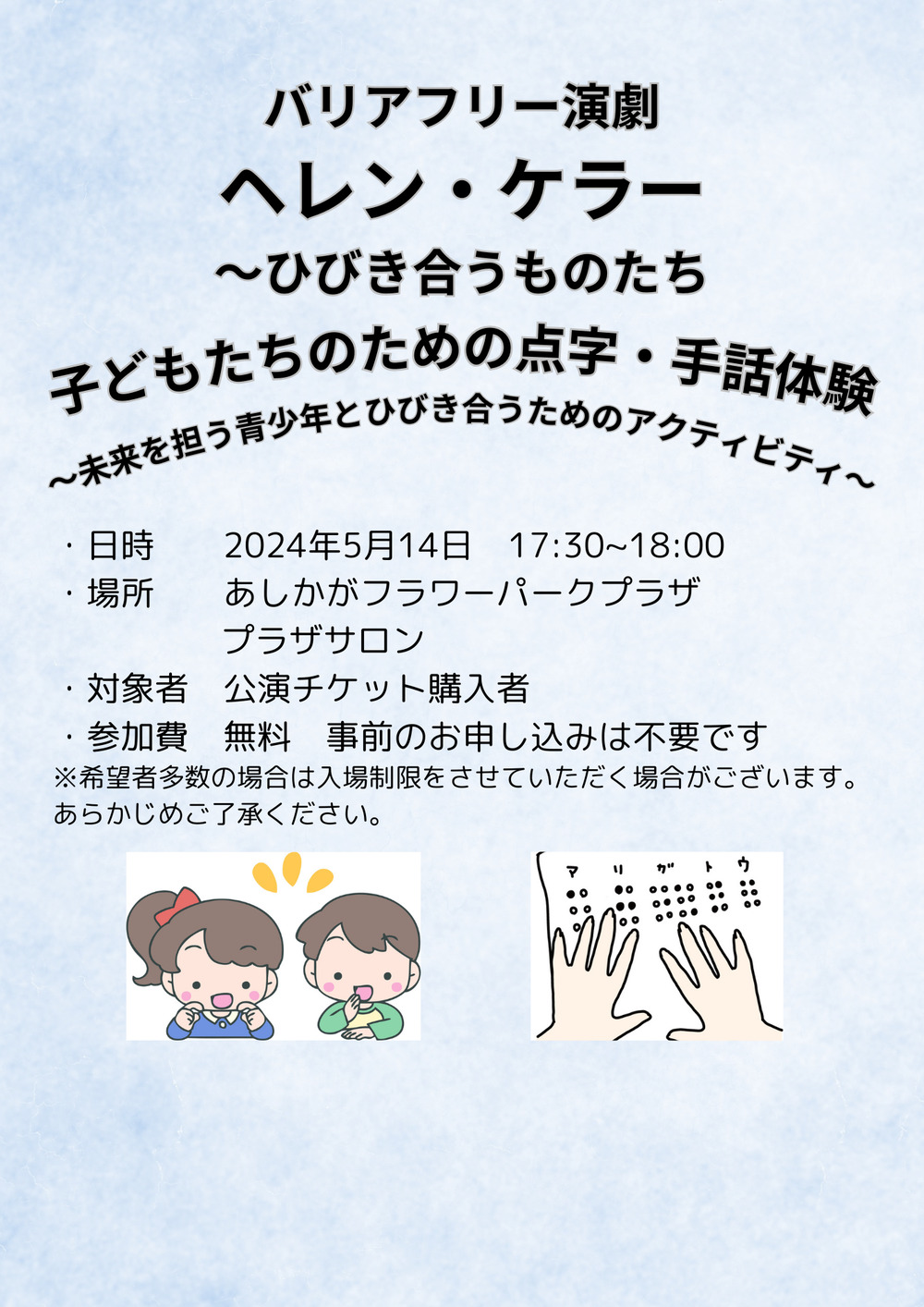 本公演は手話通訳、音声ガイド、背景に日本語字幕をつけることで、すべての環境を共有し、あらゆるバリアを超えて、みんなで一緒に楽しめる芝居をお届けいたします。