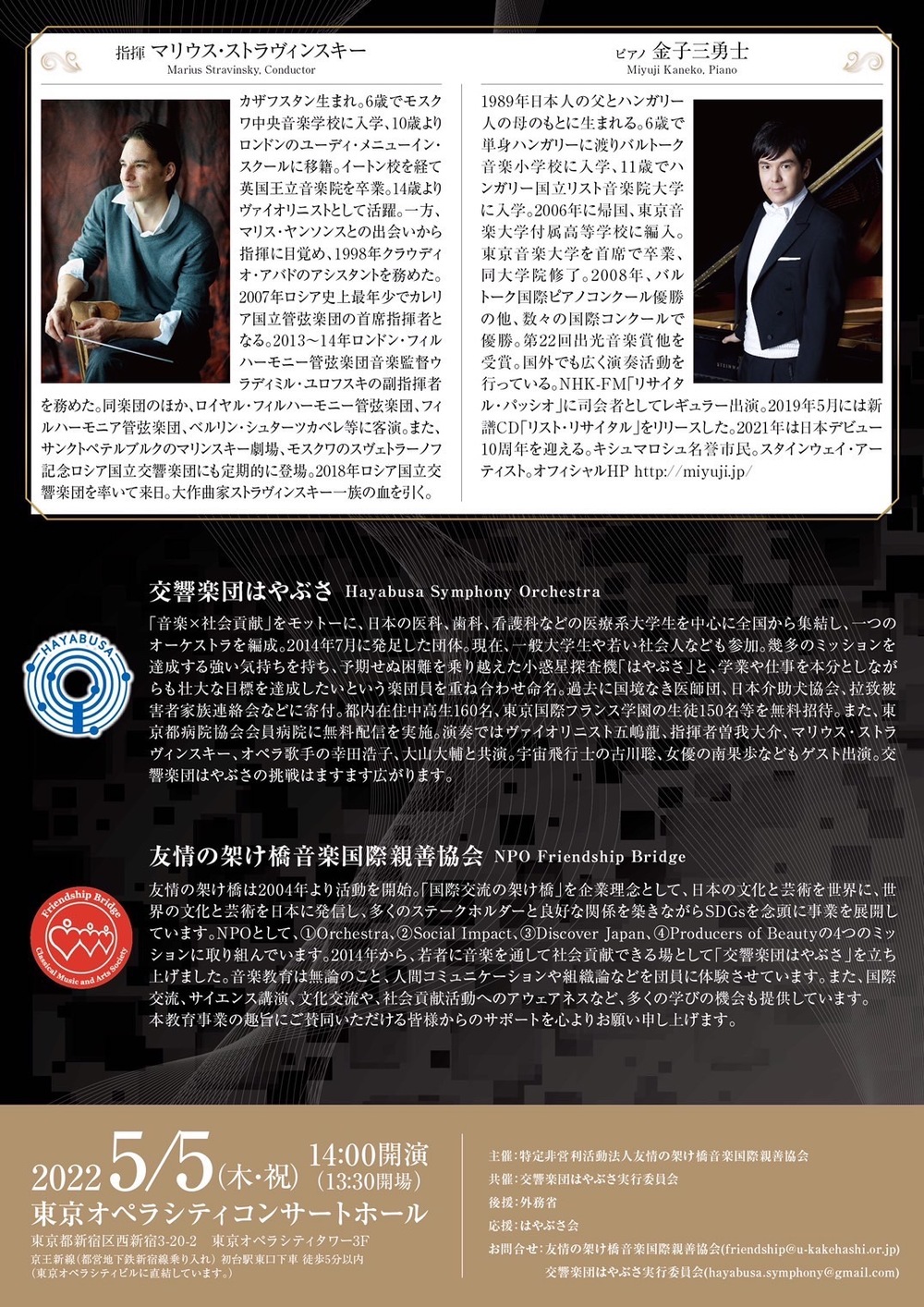 この度はマリウス・ストラヴィンスキー(指揮)と金子三勇士(ピアノ)とラフマニノフ・プログラムでウクライナを支援します。ラフマニノフはキエフ音楽院の教鞭をとり設立に尽力し、豊かな音楽文化の発展に寄与しました。とりわけ、今回取り上げるピアノ協奏曲第2番は、彼がまだ若き日に、演奏会の失敗に絶望して精神に不調をきたした後、作曲活動を再開するきっかけとなった作品として知られています。ロシア革命を機に祖国を捨て、ヨーロッパやアメリカに亡命の日々を送り、変わりゆく世界の中で葛藤し続けたラフマニノフの音楽は、今まさに社会の激動・激変に戸惑い、克服すべき大きな困難に直面する我々やウクライナにとって力強いメッセージとなることでしょう。