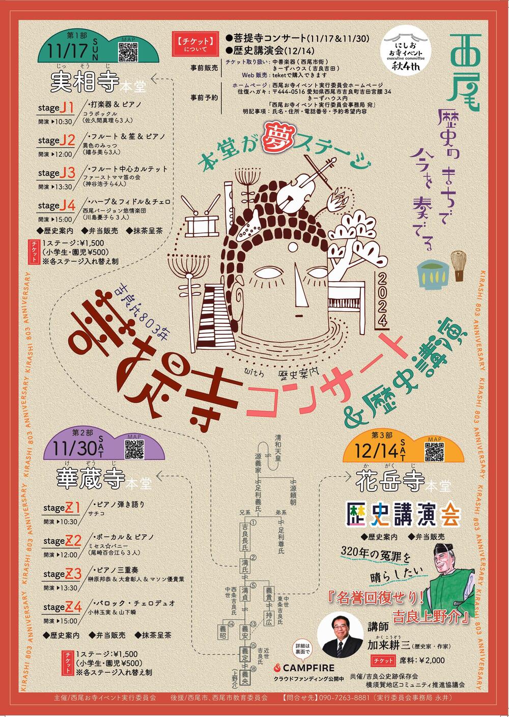 西尾市は「お寺のまち」です。市内にある寺社の数は270を超え、全国の1922市区町村の中で20番目の多さです。吉良氏ゆかりの古いお寺が多く、現在国宝となっている弥陀堂(金蓮寺)もあるなど、歴史ロマンあふれる地になっています。 お寺との連携のもと、「本堂が夢ステージ」をキャッチフレーズに多彩に展開します。主に地元の音楽家や芸術・芸能家らが出演します。コンサート、寄席、歴史講演会などを中心に開き、イベントのジャンルを増やしながら、境内での歴史案内やご当地物品販売なども含め市民コラボ参画型で毎年継続していきます。 2025(令和7年)秋のイベントは、「菩提寺コンサート 」を花岳寺(10/26)と実相寺(11/30)で、「お寺寄席」を華蔵寺(11/16)でお届けいたします。楽器演奏や声楽のミュージシャンでバラエティに富んだ音楽を、そしてアマチュア噺家による落語や漫談などを、身近にお楽しみいただけます。出演者、スタッフ一同でお待ち致しております。 会長 永井考介