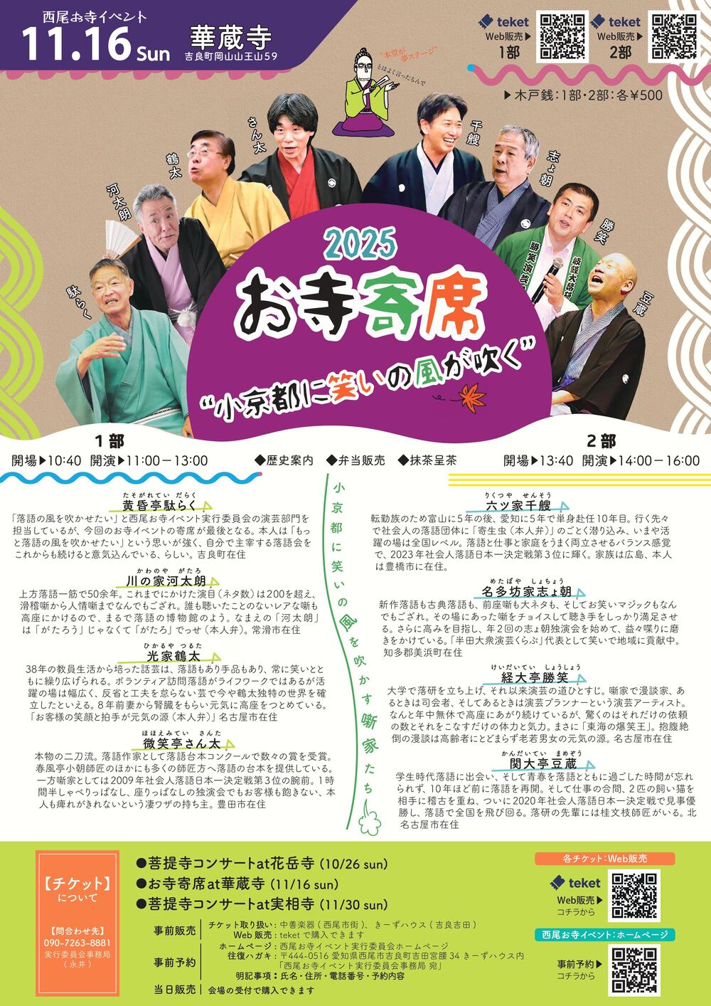 西尾市は「お寺のまち」です。市内にある寺社の数は270を超え、全国の1922市区町村の中で20番目の多さです。吉良氏ゆかりの古いお寺が多く、現在国宝となっている弥陀堂(金蓮寺)もあるなど、歴史ロマンあふれる地になっています。 お寺との連携のもと、「本堂が夢ステージ」をキャッチフレーズに多彩に展開します。主に地元の音楽家や芸術・芸能家らが出演します。コンサート、寄席、歴史講演会などを中心に開き、イベントのジャンルを増やしながら、境内での歴史案内やご当地物品販売なども含め市民コラボ参画型で毎年継続していきます。 2025(令和7年)秋のイベントは、「菩提寺コンサート 」を花岳寺(10/26)と実相寺(11/30)で、「お寺寄席」を華蔵寺(11/16)でお届けいたします。楽器演奏や声楽のミュージシャンでバラエティに富んだ音楽を、そしてアマチュア噺家による落語や漫談などを、身近にお楽しみいただけます。出演者、スタッフ一同でお待ち致しております。 会長 永井考介