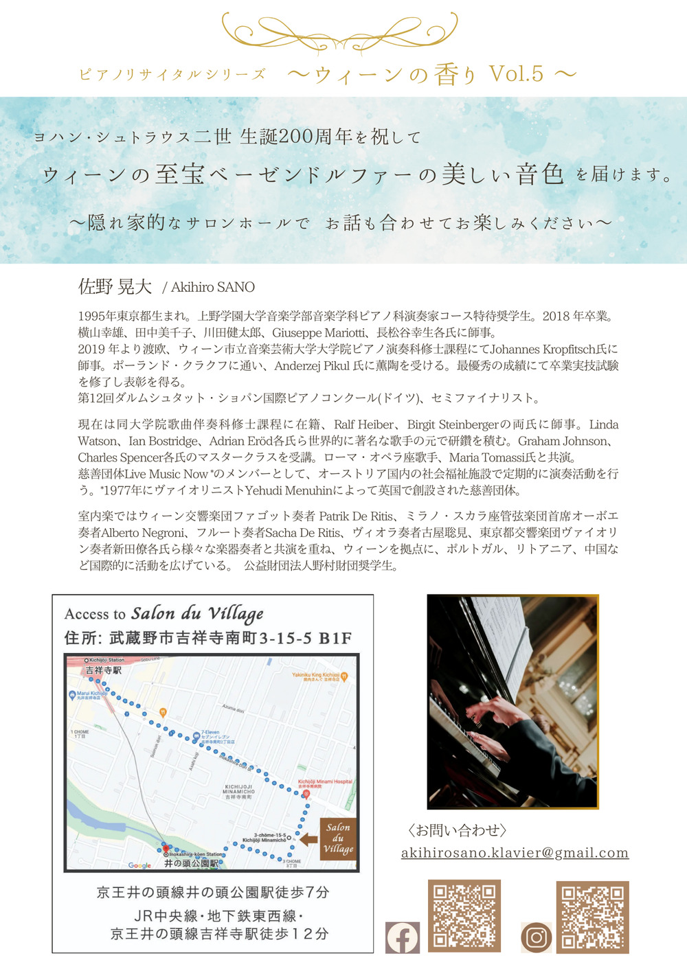 ワルツの王様ヨハン・シュトラウス2世の生誕200周年を祝して、ウィーンにゆかりのある作曲家の音楽を、ウィーンの至宝ベーゼンドルファーの音色と共にお届けします。時代を超えて今もなお世界中で愛される、甘美で、どこか懐かしい、心に沁み渡るウィーンの旋律をどうぞごゆっくりお楽しみください。7月5日(土)にも同じ内容のコンサートを駒場東大前のムジク・ピアフォーヌ様にて行うので、ご都合のよろしい方に是非お越しください。
