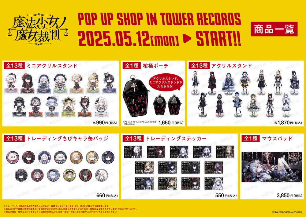 タワーレコード渋谷店2F エスカレーター横スペースにて、5月12日(月)から6月5日(木)の期間、「『魔法少女ノ魔女裁判』 POP UP SHOP IN TOWER RECORDS」を開催いたします!