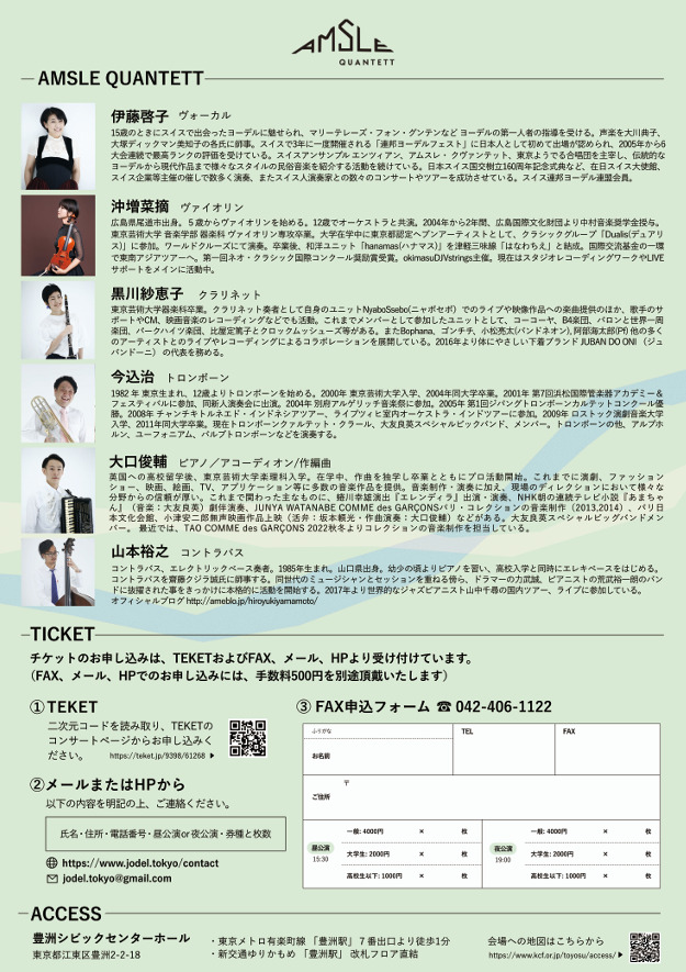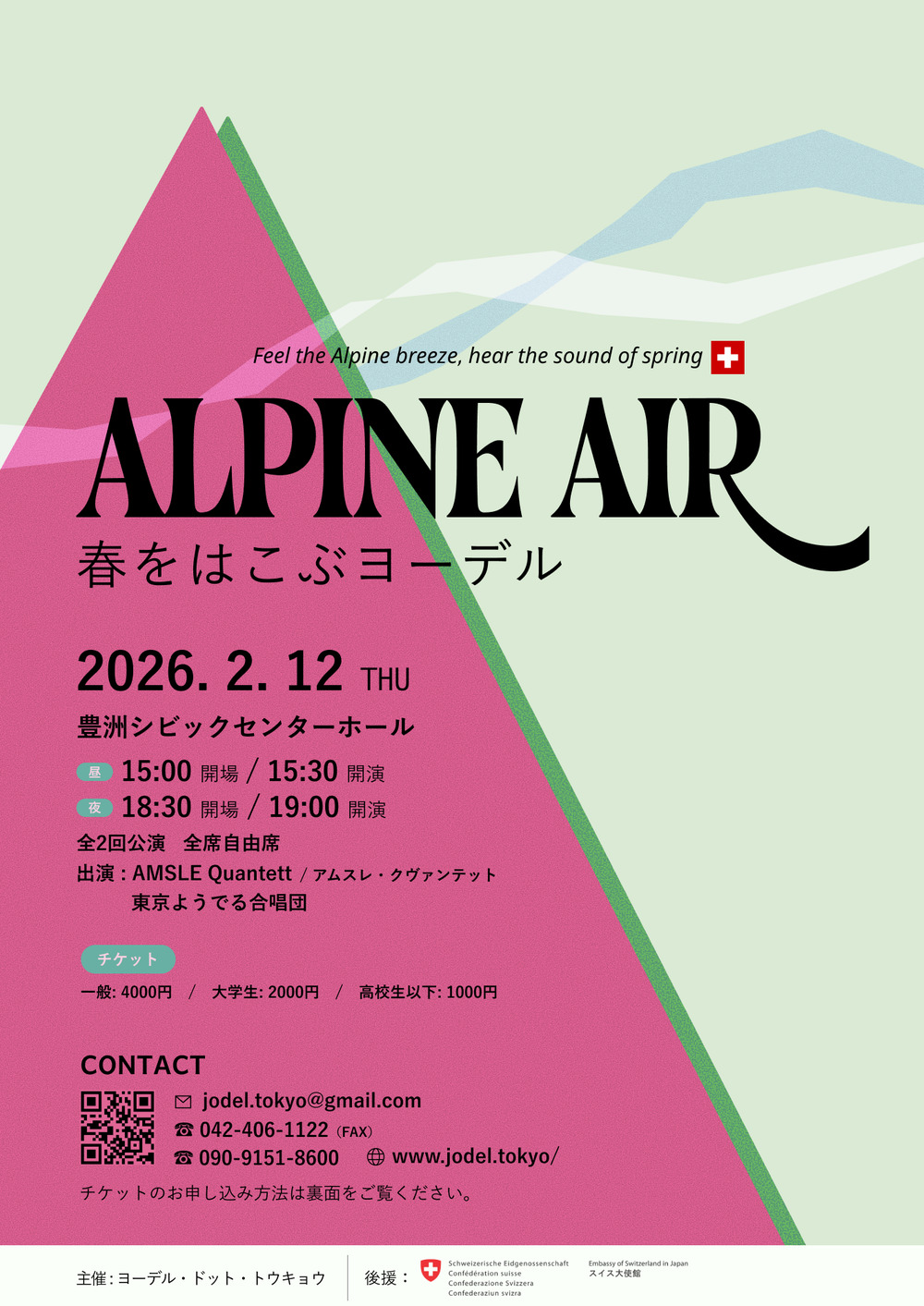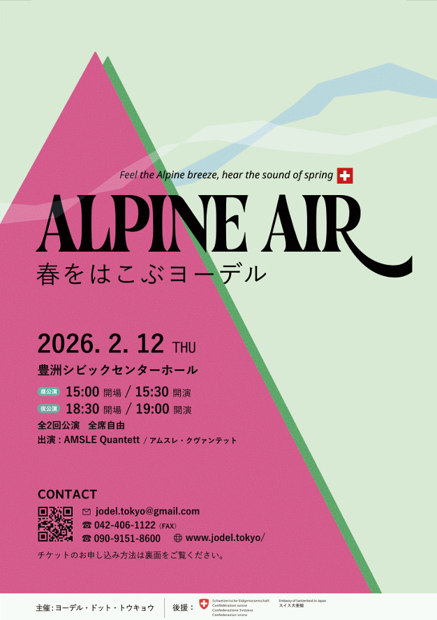 UNESCO 世界文化遺産に登録されたスイスのヨーデルをお聴きいただくコンサートです。スイスにまつわる楽しいお話しと、珍しい民俗楽器の音色も交え、伝統的なヨーデルから洗練されたアレンジまでスイス音楽を多彩に演奏いたします。アルプスに春の訪れを告げるヨーデルの響きとともに心地よいひとときをお過ごしください♪