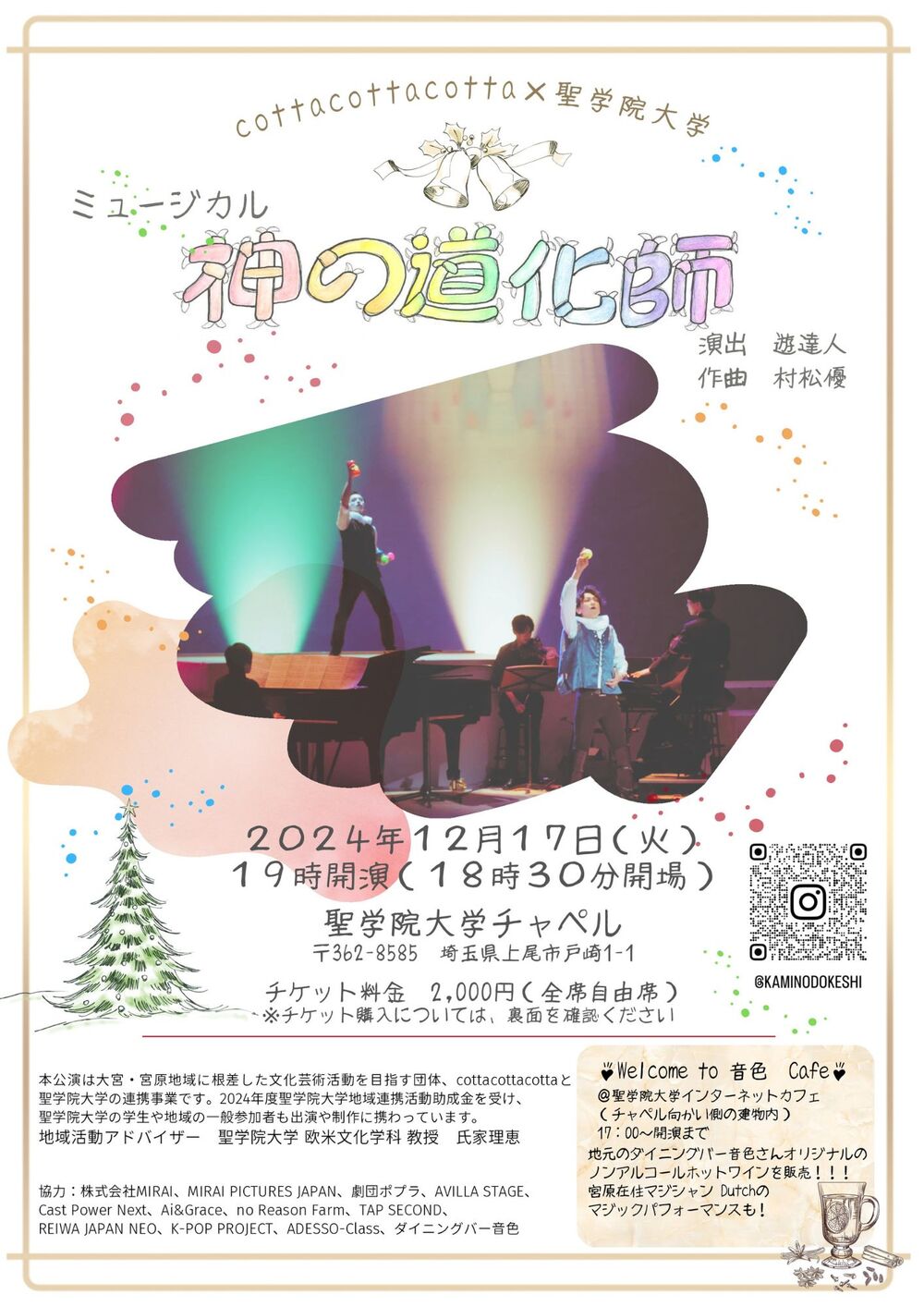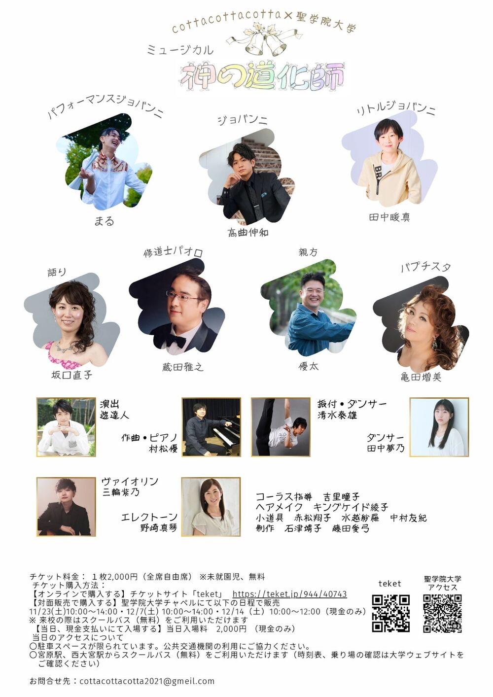また、今回は実力派のメインキャストに加えて、各地からやる気にあふれるアンサンブルやコーラスのメンバーも参加します。聖学院学生や地域の方々も参加し、地域の振興にも意識を向け、ご来場の皆様に楽しんで頂けるクリスマスらしい作品をお届け致します!
