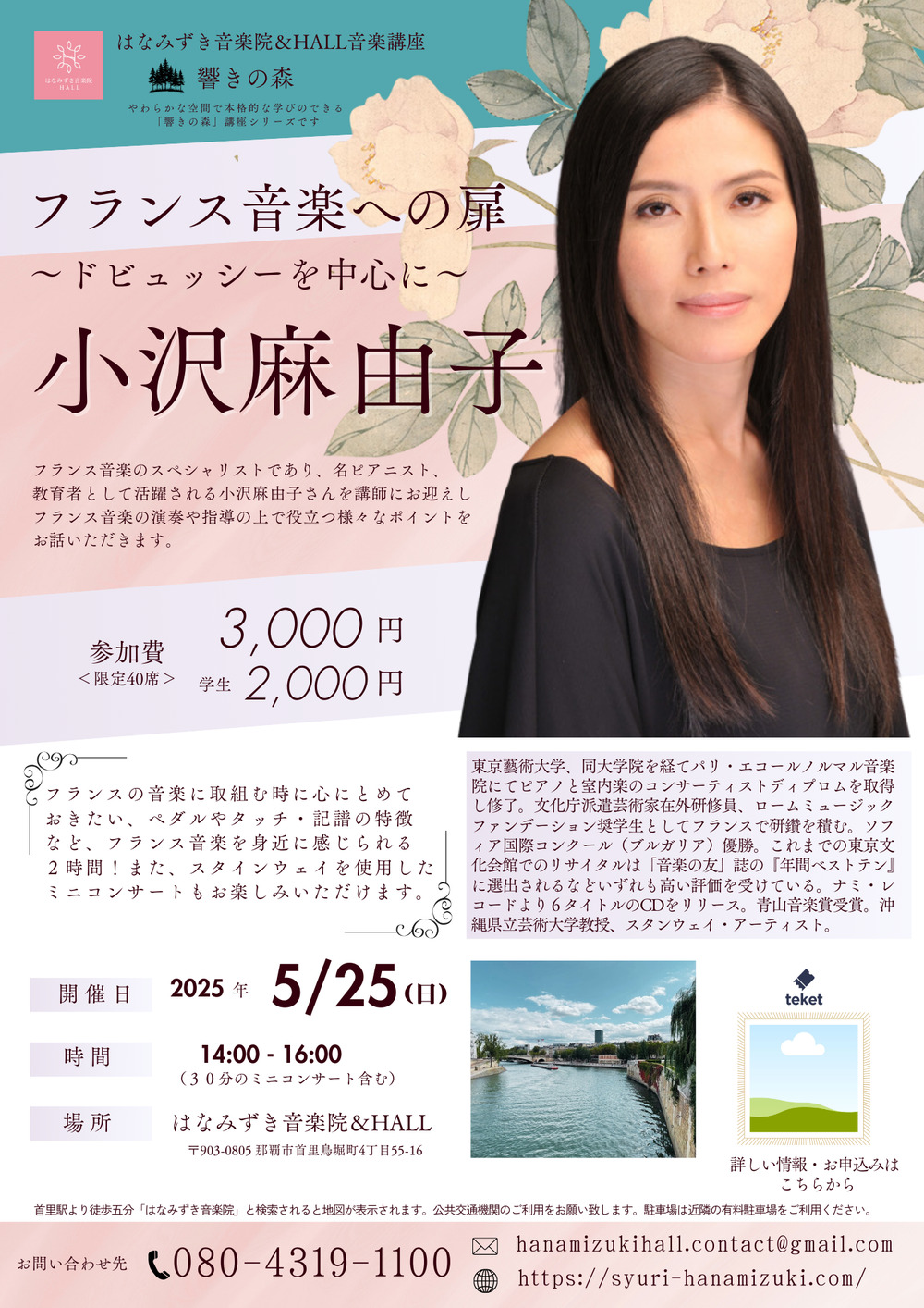 フランスの音楽に取組む時に心にとめておきたい、記譜の特徴について(3段譜、スタッカート、テヌート)、ペダル・タッチについて、響きの特徴など、フランス音楽が身近に感じられる2時間!また、スタインウェイを使用したミニコンサートもお楽しみいただけます。