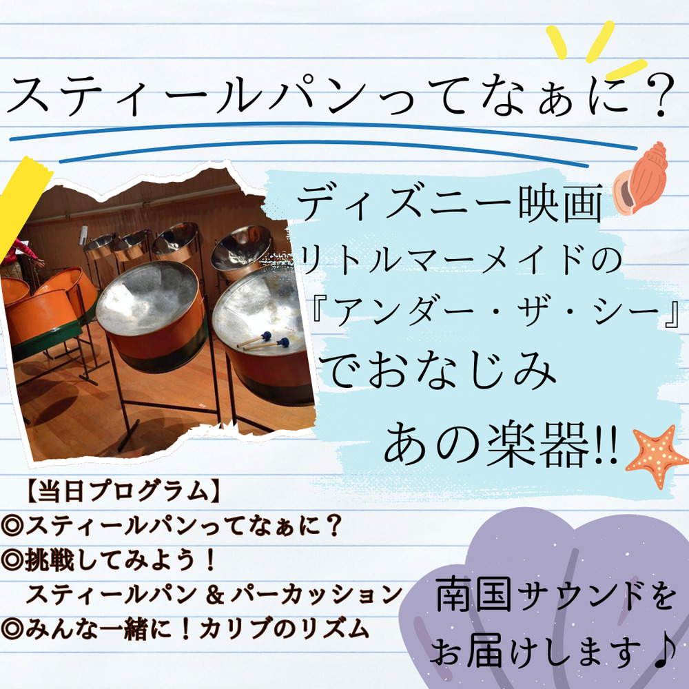 カリブ海に浮かぶ島トリニダード・トバゴ共和国で誕生した不思議な楽器スティールパン。ドラム缶で できたとは思えないこの楽器から生まれる透明で繊細な音色は、ディズニー映画「リトルマーメイド」の「アンダー・ザ・シー」でもおなじみ!