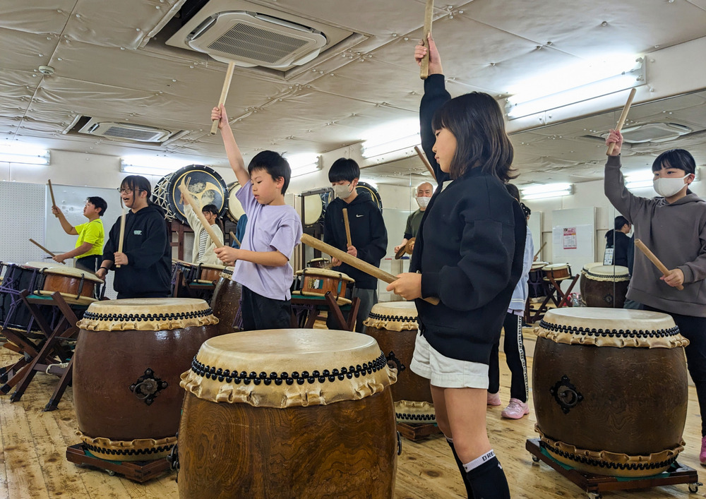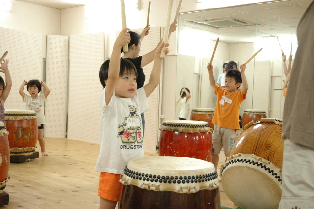 お子様と保護者のペアでご参加いただけるクラスです。大人も子供も真剣に太鼓に向かって楽しみます。