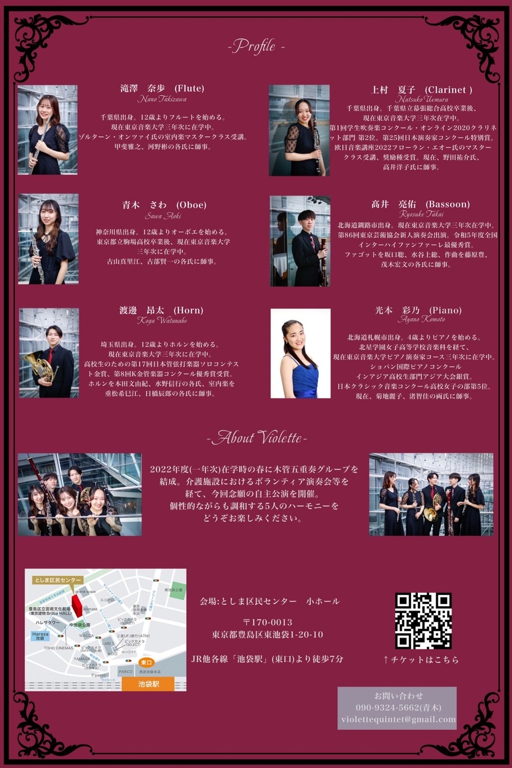 その他のお問い合わせ先:メールアドレス:violettequintet@gmail.com