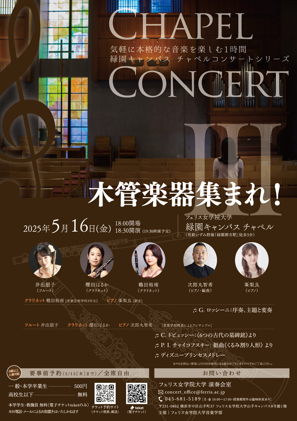 神聖な雰囲気のチャペルで音楽を楽しむ「チャペルコンサートIII 〜木管楽器集まれ!〜」。