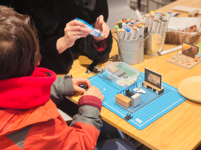 大人もお子様も楽しめる、建築模型ワークショップです。自然の中に居場所を探し、心地よさを求めて工夫を試みる。そんな建築の原点を、ミニチュアの世界で体験しましょう。1つの鉢植えから、それぞれの枝ぶりや葉の向き、形を観察し、その隙間でどんなことをしたいかを形にします。葉っぱの影でお昼寝をしたり、枝葉を眺めるサウナがあったり。暮らしのシーンやアクティビティを想像すると、小さな隙間に多くの可能性が見えてきます。作った鉢植え模型は持ち帰り、日常に余白の楽しみを思い描くアイテムとしてお使いください。