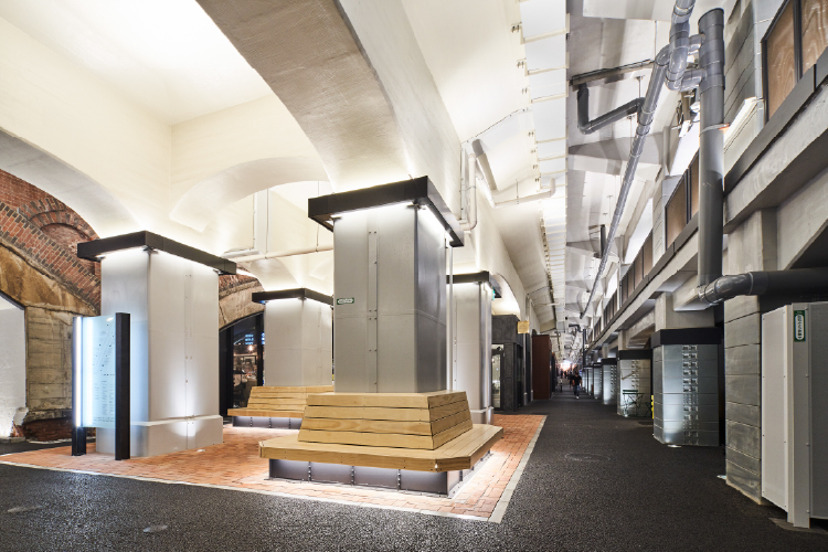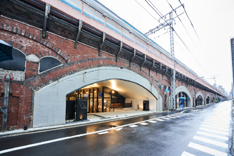 明治期、ベルリンの高架橋をモデルに築かれた煉瓦アーチと、昭和の鉄筋コンクリート高架橋が共存する日比谷OKUROJI。3世代の鉄道高架橋を一体開発して2020年に誕生しました。その歴史を、開発担当者とともに紐解きます。各時代の建築様式が共存し、異なる歴史を持つ構造物が融合した空間を活用した、全長約300メートルの通路は、各店舗が高架橋の躯体で見え隠れすることで、路地のような雰囲気を持つ空間設計となっています。
