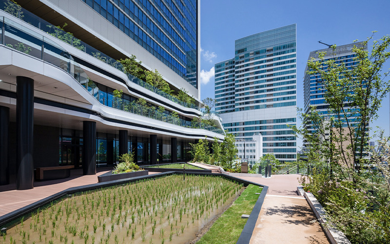 水田、菜園、養蜂、レインガーデン。東京ポートシティ竹芝では、東京湾を望む地上6層の階段状緑地に、都市に多様な生態系を育む取り組み「竹芝新八景」を展開しています。その準備段階から運営まで担う水野さえ子さんの案内で、高速道路上空を越える歩行者デッキとスキップテラスを巡りながら、自然と都市デザインの融合を体感します。