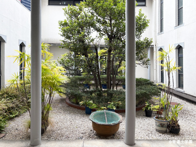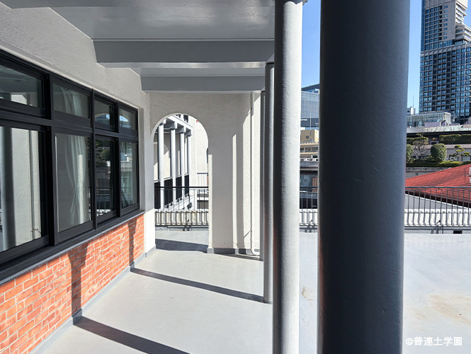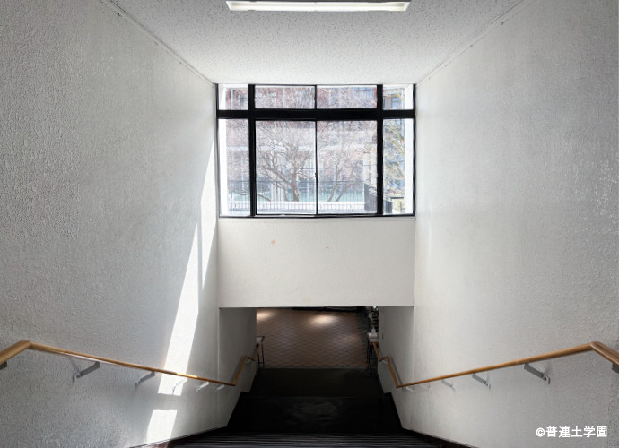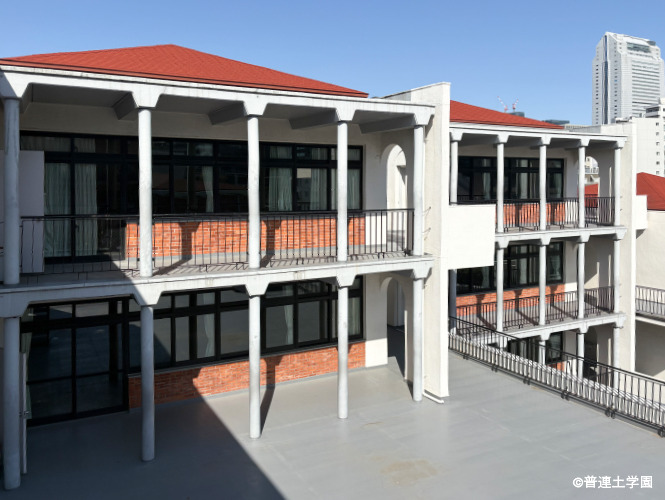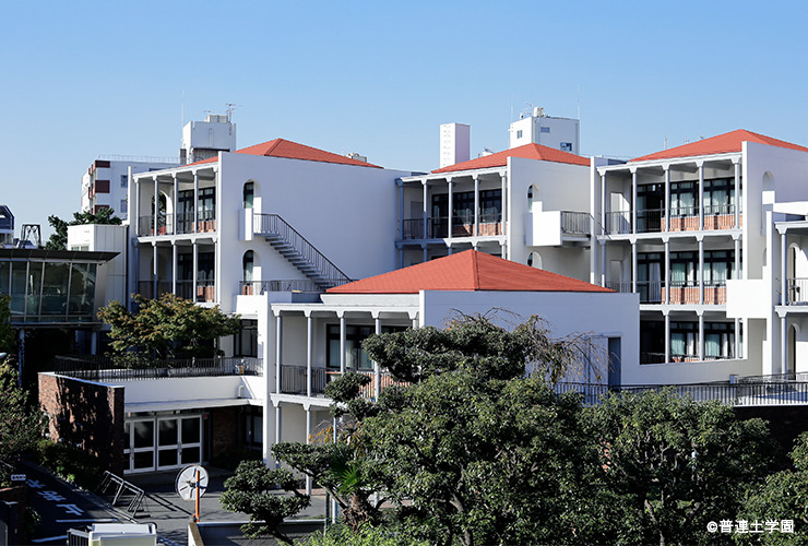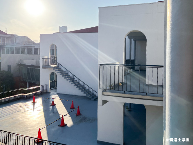 1968年、大江宏が学園の教育理念をかたちとして表現することを目指して設計した普連土学園 中学校舎。2017年3月には東京都選定歴史的建造物にも選ばれています。起伏ある敷地を読み込んだ配置計画により、一般的な学校建築のかたちから外れ、2階から4階へと変化する構成が、学びの場に豊かなリズムをもたらします。合理性一辺倒に収まらない造形と空間の連なりも見どころです。教室棟の開口部に並ぶ5本の独立円柱と、その上に架かる宝形屋根が描く独自の外観を手がかりに、建築が支える日常の時間を味わってください。