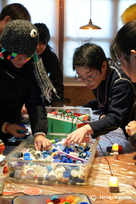 世界に一つだけのオリジナル照明をつくります。サステナブルな素材を用いたワークショップを国内外で展開するPimlico Arts Japanとともに、海洋プラスチックごみを活用し、USB電源で光るランプを制作します。電源のアクリルボックスの素材も、コロナ禍で使われていたパーテーションです。廃棄される素材に新たな価値を見出すアップサイクルのプロセスは、建物の価値を再生するリノベーションにも通じています。完成した照明はそのままお持ち帰りできます。
