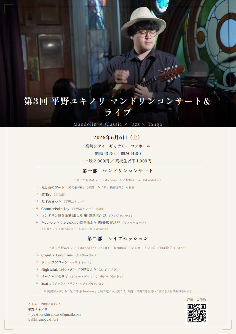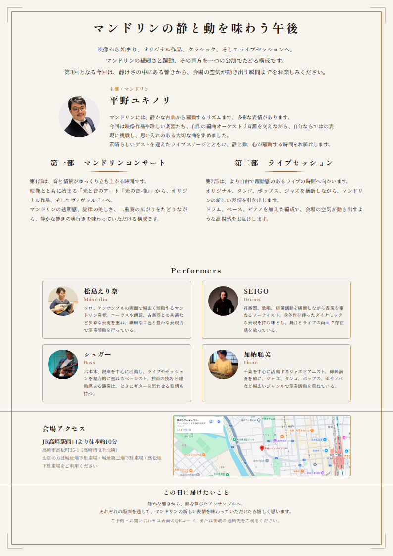 ソロ演奏を軸に、初演作品の披露、映像アートとの共演、そしてジャズセッションまで――マンドリンの新たな可能性をお届けする約90分のステージです。