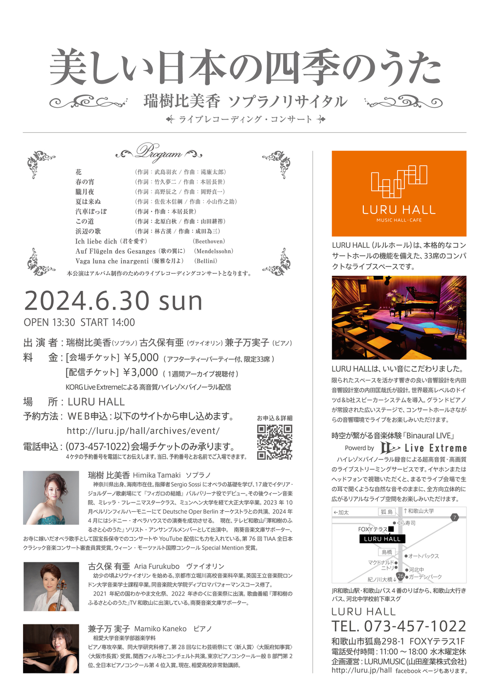 出演:瑞樹比美香(ソプラノ) 古久保有亜(ヴァイオリン) 兼子万実子(ピアノ)