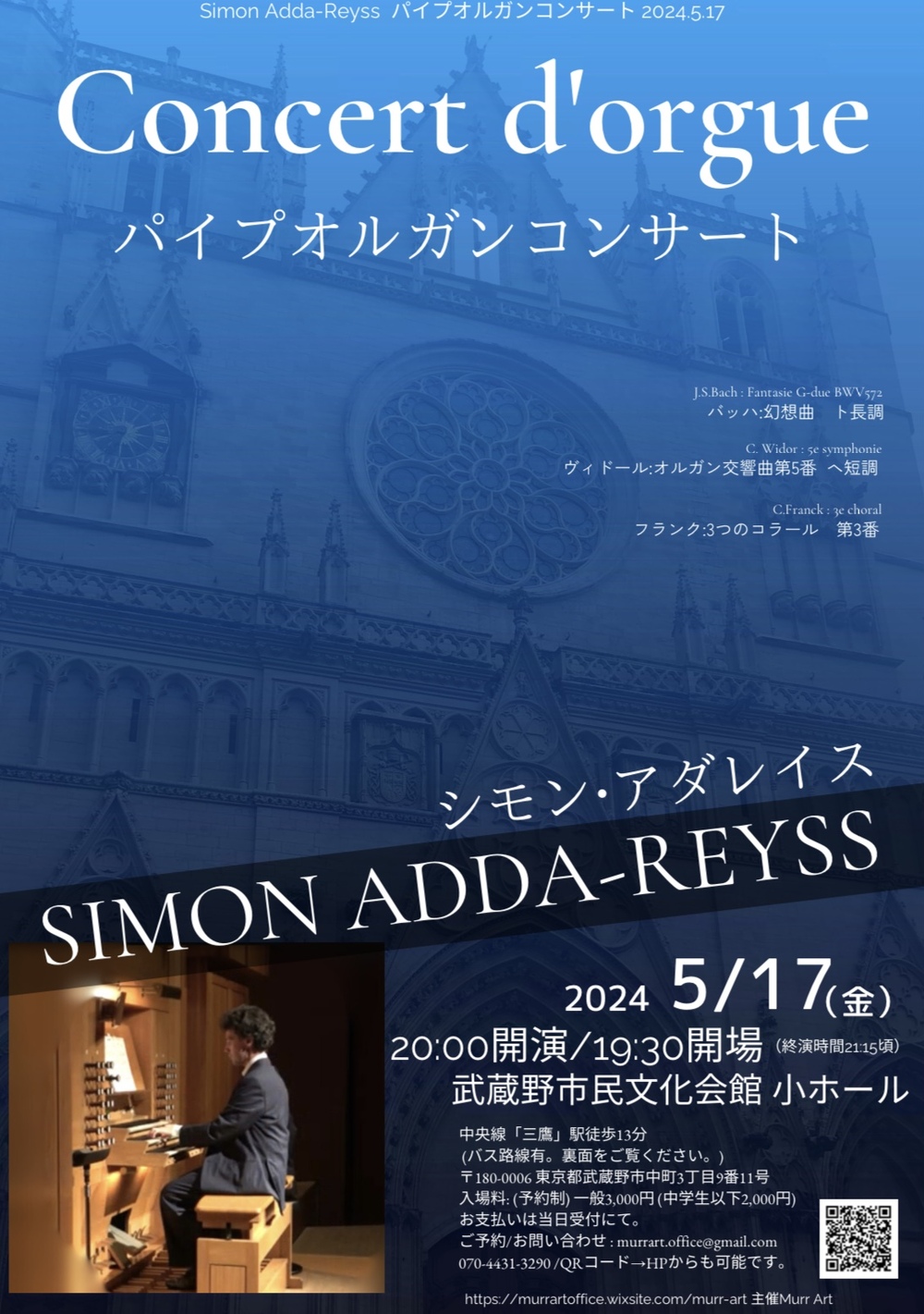 パリ高等音楽院などの名門音楽大学で教鞭を執り、ヨーロッパクラシック音楽の伝統を受け継ぐ天才音楽家シモン・アダレイス氏によるパイプオルガンコンサート。