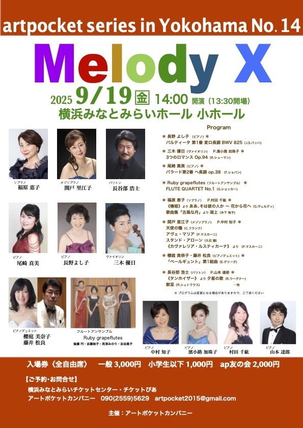 海の見えるホールでのシリーズ《Melody》10回目は、ピアノソロ、ヴァイオリンソロ、フルートアンサンブル、オペラアリアに歌曲、ピアノデュエットなど、盛りだくさんのプログラムで、それぞれが思いを込めたメロディを演奏いたします。どうぞお楽しみください。