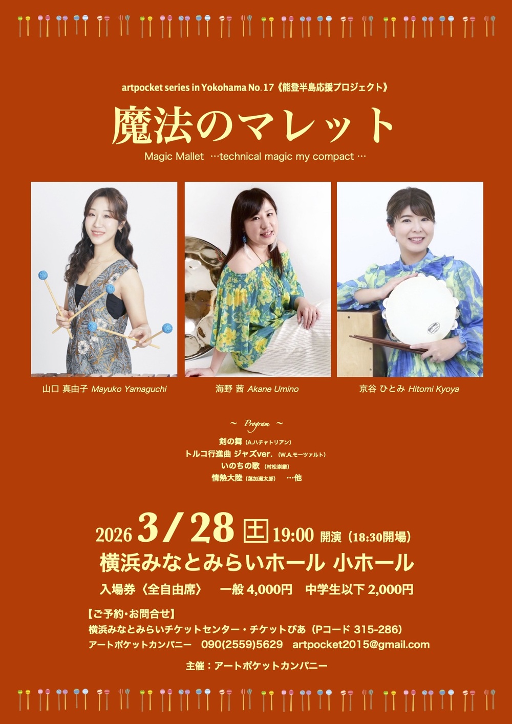 現在活躍中の女性打楽器奏者3人による楽しいステージをお楽しみいただき、遠く離れた能登半島を応援します。