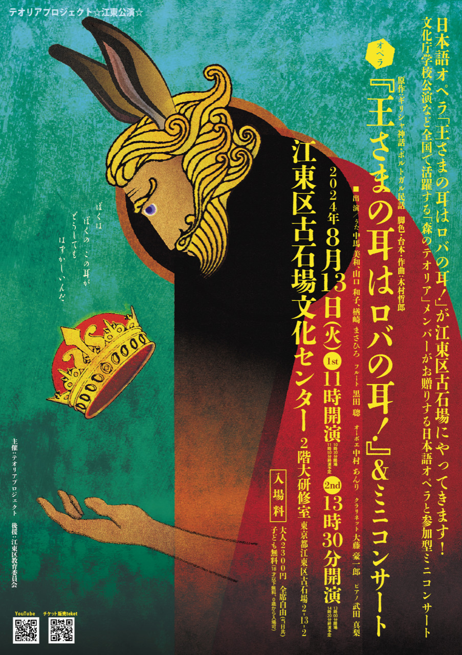 2024年3月に初演された新作オペラ「王さまの耳はロバの耳!」が夏休みに江東区古石場文化センターにやってきます!埼玉、神奈川、千葉、東京(下北沢)でのホール公演を経て、2024春夏シーズンの千秋楽(最終公演)です。0歳から入場可能、18歳以下は無料!文化庁公演など全国で活躍する「森のテオリア」メンバーがお贈りする日本語オペラ「王さまの耳はロバの耳!」に是非ご来場くださいませ。