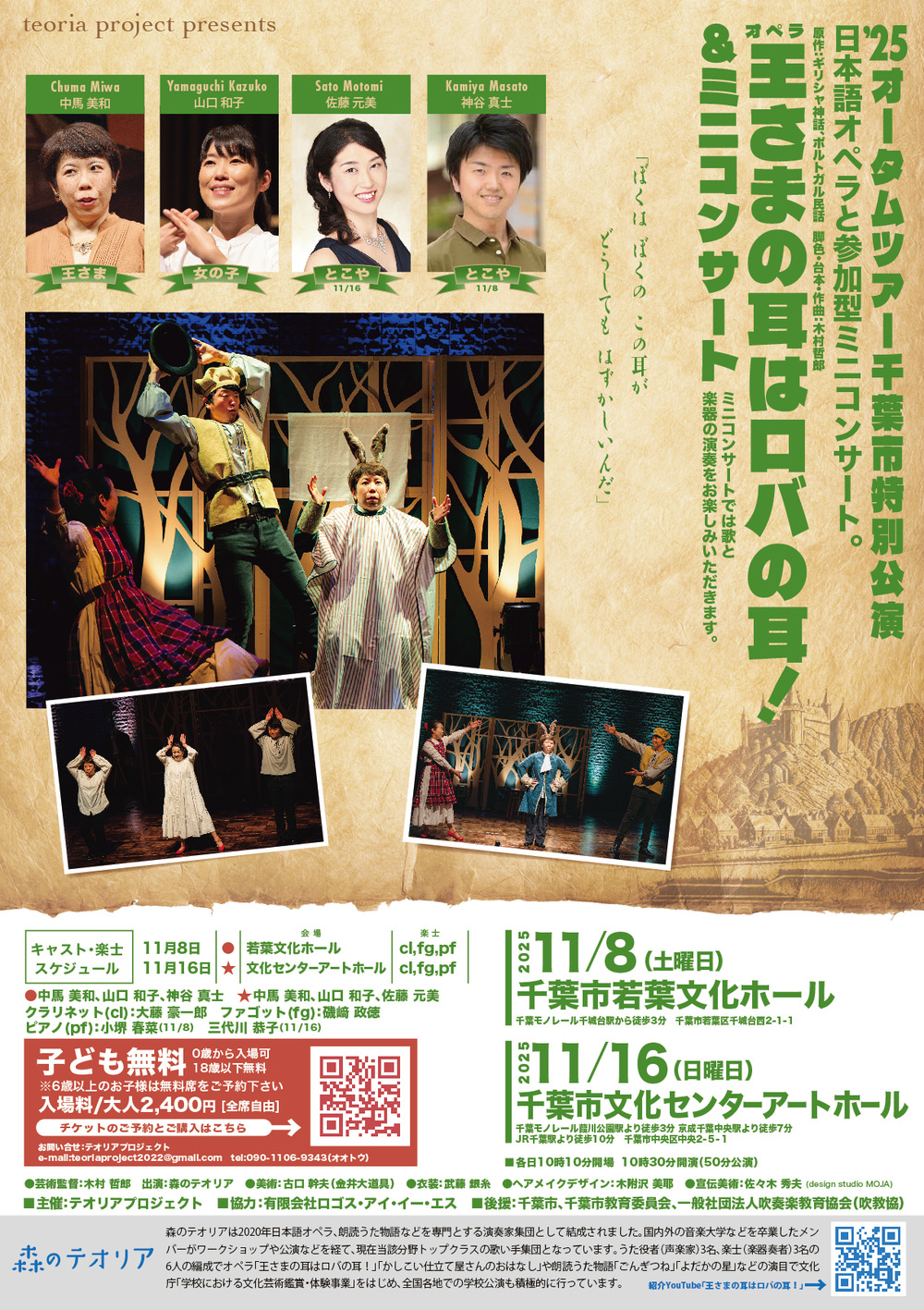 2025年秋、森のテオリアの大人気オペラ「王さまの耳はロバの耳!」がついに千葉市に!0歳から入場可能、18歳以下は無料!文化庁公演など全国で活躍する「森のテオリア」6人がお贈りする笑いと少し心があたたまる舞台。ご家族やお友達と普段のお出かけスタイルでお気軽にご来場ください!