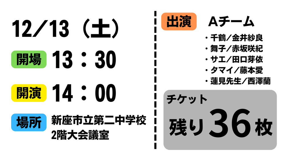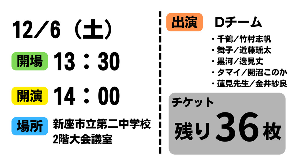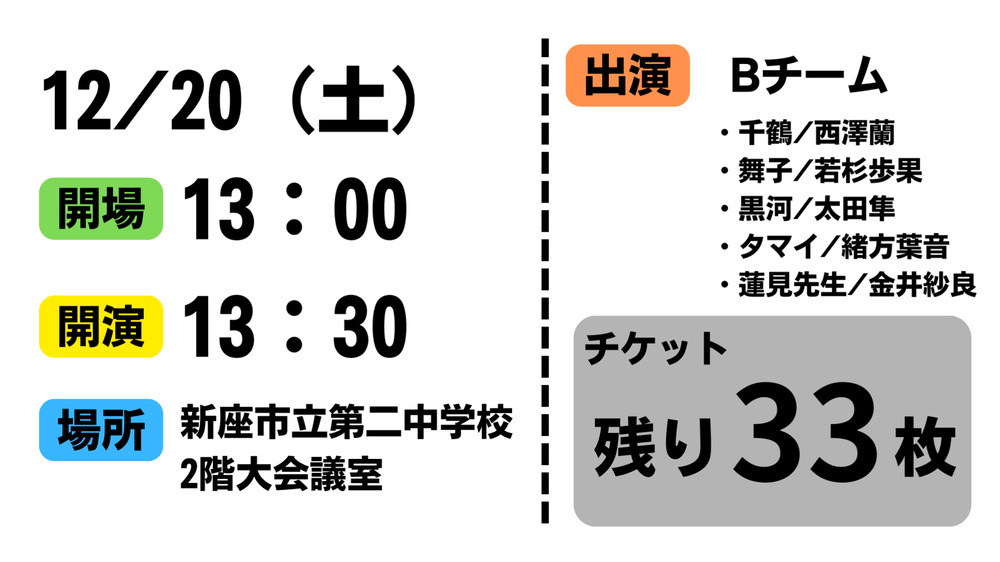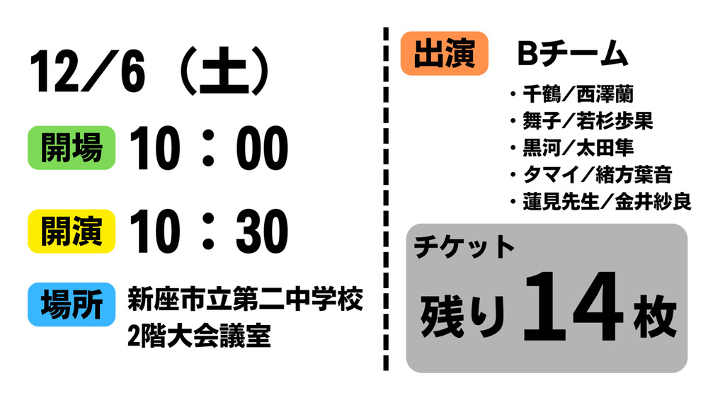 11月30日午後公演 Cチームは”13︰30会場” ”14︰00開演”となりますお間違えの無いようにお願いします