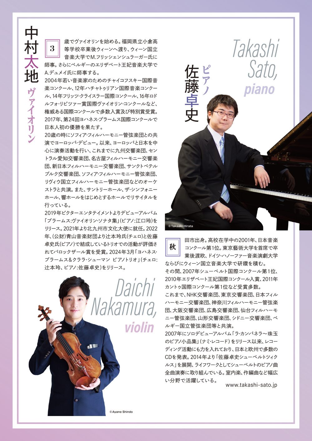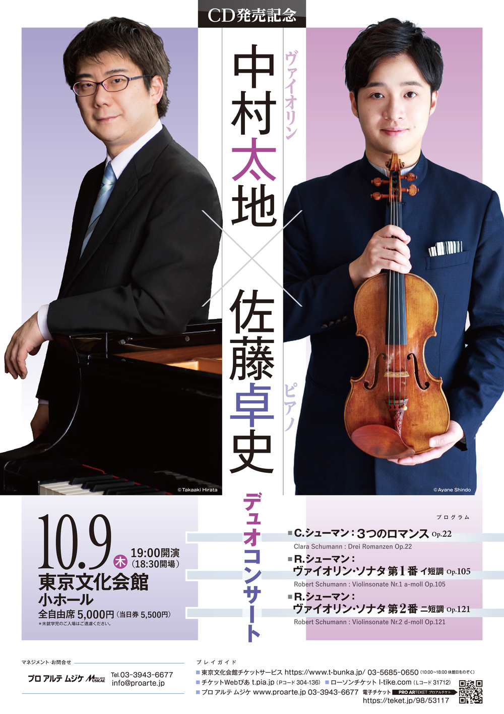 多数のコンクール受賞歴を誇る若きヴァイオリニスト中村太地。今作は盟友、佐藤卓史(ピアノ)とのデュオ編成で、クララ・シューマンによる3つのロマンス、またシューマンのソナタ第1番、第2番に挑みます。