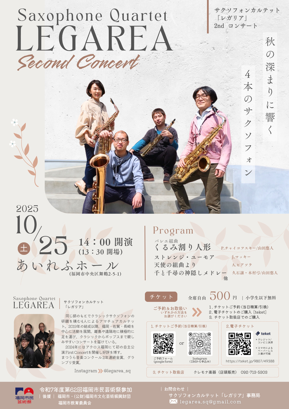 同じ師の元でクラシックサクソフォンの研鑽を積む4人によるアマチュアカルテット。2019年の結成以降、福岡・佐賀・長崎を中心に活動を展開、クラシックからポップスまで親しみやすいコンサートを届けている。2024年にはアクロス福岡にて初の自主公演 First Concertを開催。まつうら音楽コンクール 2年連続金賞、グランプリ受賞。