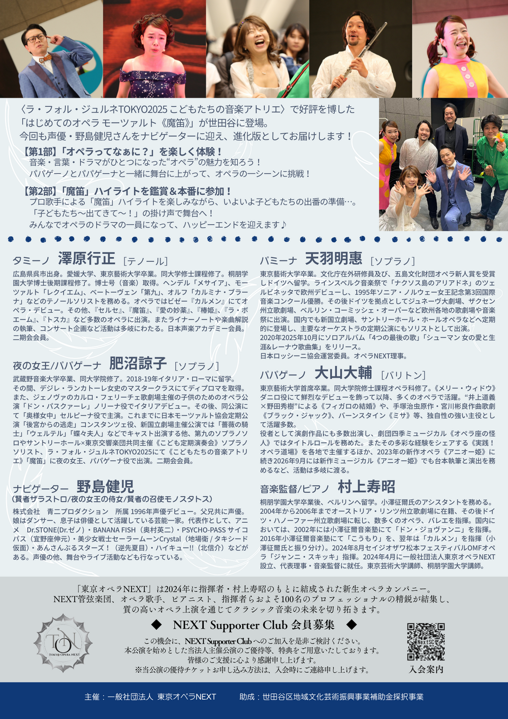 〈ラ・フォル・ジュルネTOKYO2025 こどもたちの音楽アトリエ〉で好評を博した「はじめてのオペラ モーツァルト《魔笛》」が世田谷に登場。今回も声優・野島健児さんをナビゲーターに迎え、さらにバージョンアップした進化版としてお届けします!