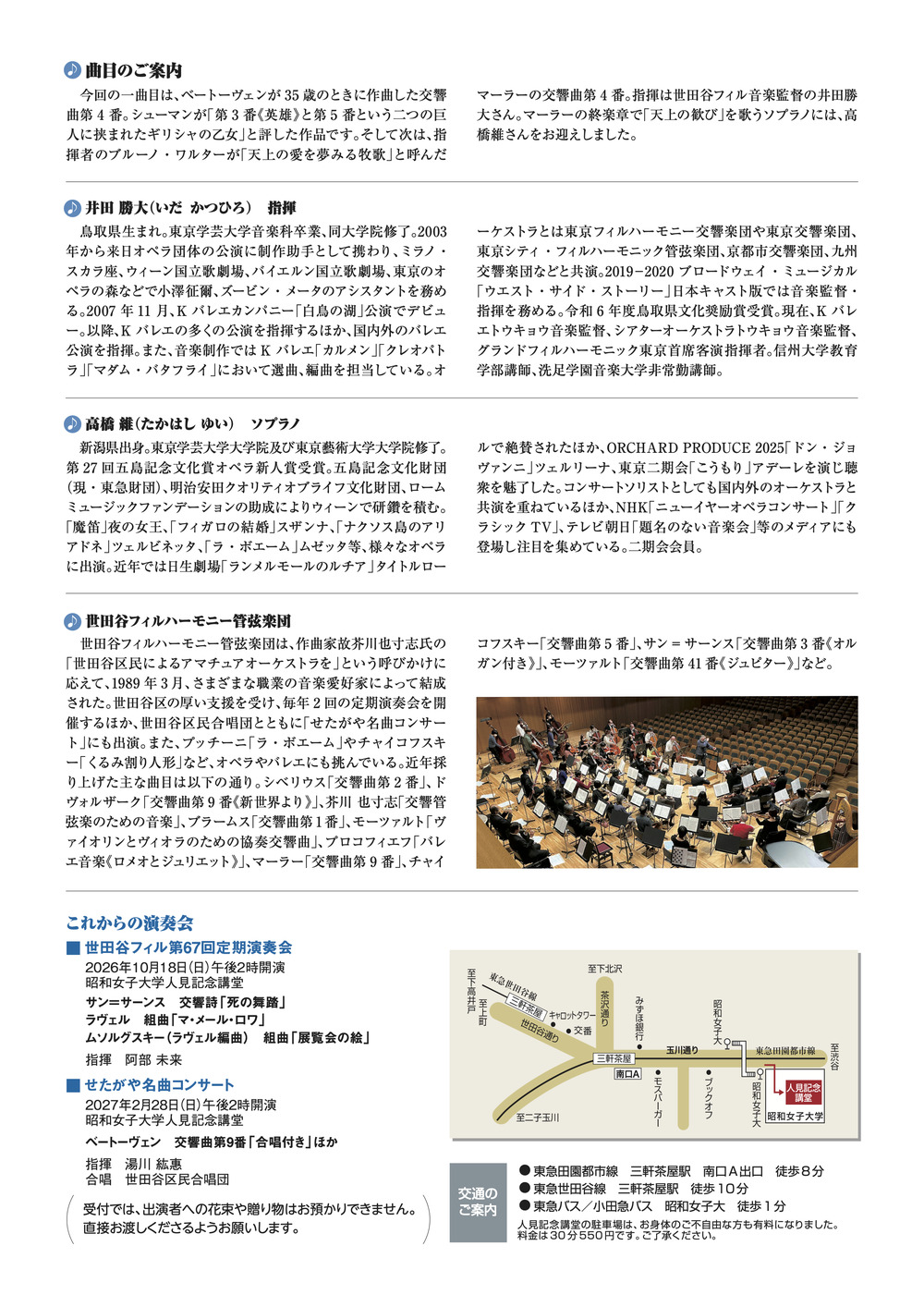 そして次は、指揮者のブルーノ・ワルターが「天上の愛を夢みる牧歌」と呼んだマーラーの交響曲第4番。指揮は世田谷フィル音楽監督の井田勝大さん。マーラーの終楽章で「天上の歓び」を歌うソプラノには、高橋維さんをお迎えしました。