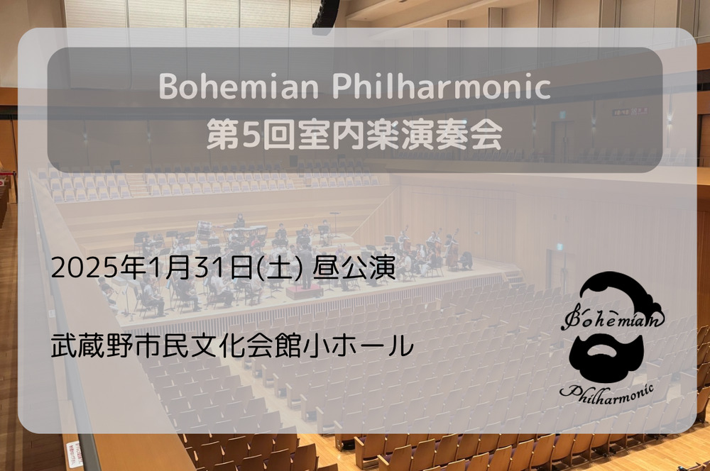 室内楽演奏会としては5回目となる本演奏会は、弦楽合奏に加え初となる吹奏楽楽曲を取り扱います。その他、ボヘミアにまつわる作曲家はじめ幅広いジャンルの室内楽曲をお届けいたします。