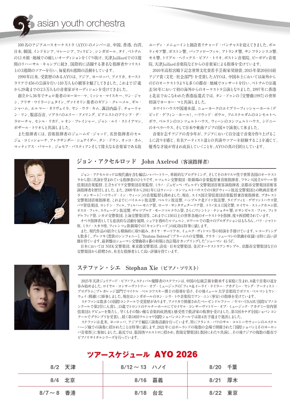 本年3月にオーディションで選ばれた若者100人によるオーケストラ 毎年オーディションによってアジアの優秀な若者がえらばれるので、今年の音は今年だけ。AYO(アジアユースオーケストラ)は1990年から活動、今年で36年になります。チェロ奏者ヨーヨー・マ、ミッシャ・マイスキー、ヴァイオリン奏者ギル・シャハム、諏訪内晶子など著名なアーティストとも共演しました。2010年高松宮殿下記念世界文化賞若手芸術家奨励賞、2015年第20回日経アジア賞(文化・社会部門)受賞。
