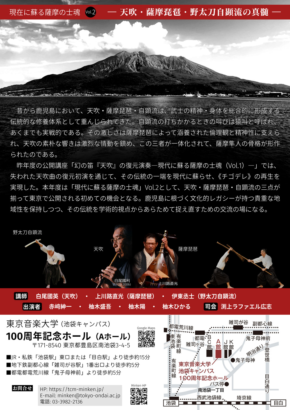 昨年度の公開講座「幻の笛『天吹』の復元演奏―現代に蘇る薩摩の士魂(Vol.1)―」では、失われた天吹曲の復元初演を通じて、その伝統の一端を現代に蘇らせ、《チゴデレ》の再生を実現した。本年度は「現代に蘇る薩摩の士魂」Vol.2として、天吹・薩摩琵琶・自顕流の三点が揃って東京で公開される初めての機会となる。鹿児島に根づく文化的レガシーが持つ貴重な地域性を保持しつつ、その伝統を学術的視点からあらためて捉え直すための交流の場になる。