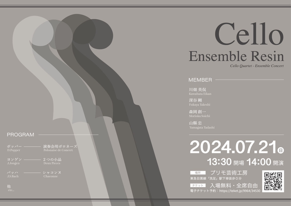 2024年に生まれた新しいチェロアンサンブル団体、Cello Ensemble Resinです。クラシックからポップスまで幅広いレパートリーでチェロアンサンブルの素敵な響きをお届けします。