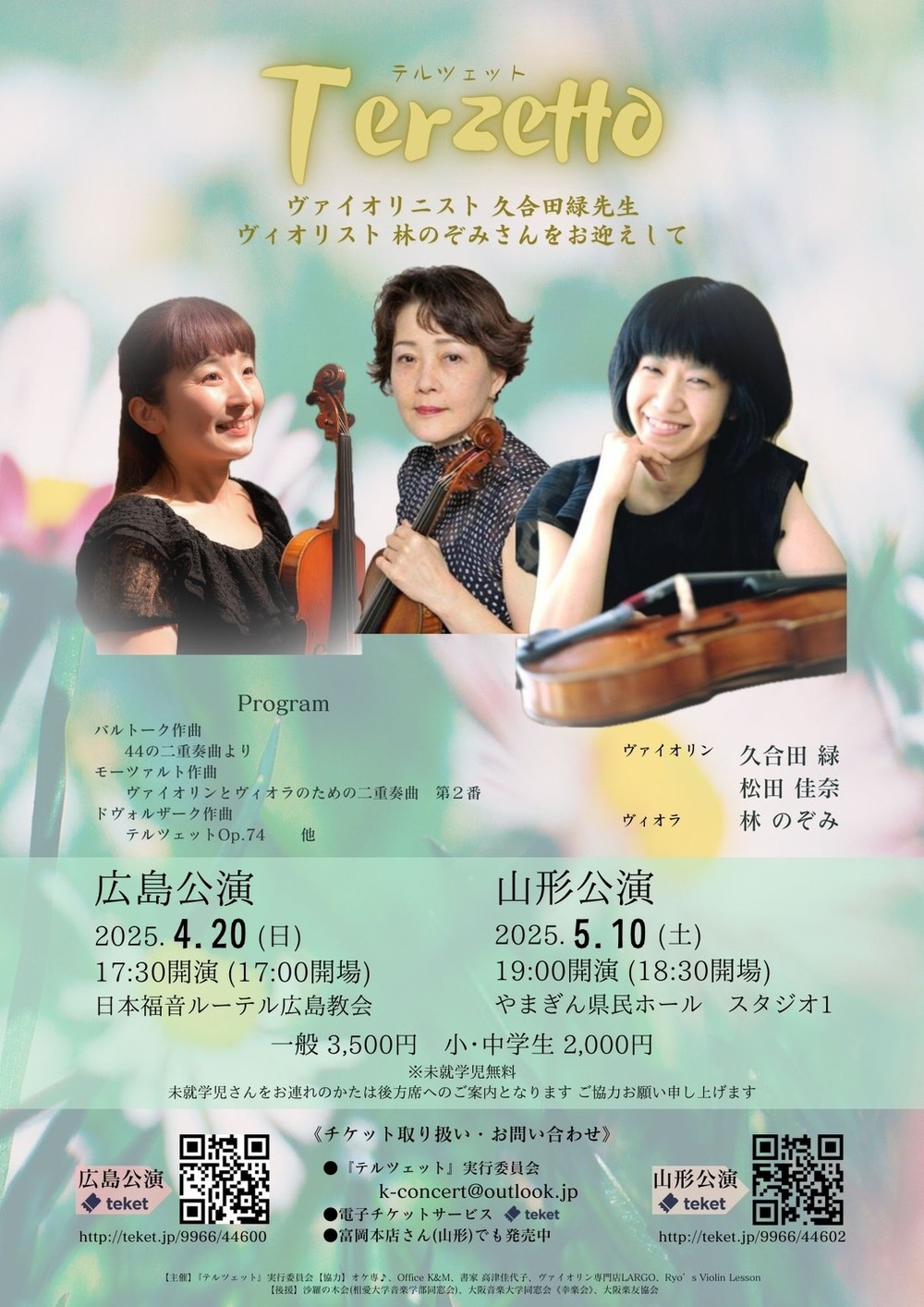 ヴァイオリニスト久合田緑先生とヴィオリスト林のぞみさんを山形にお迎えしコンサートを行います。