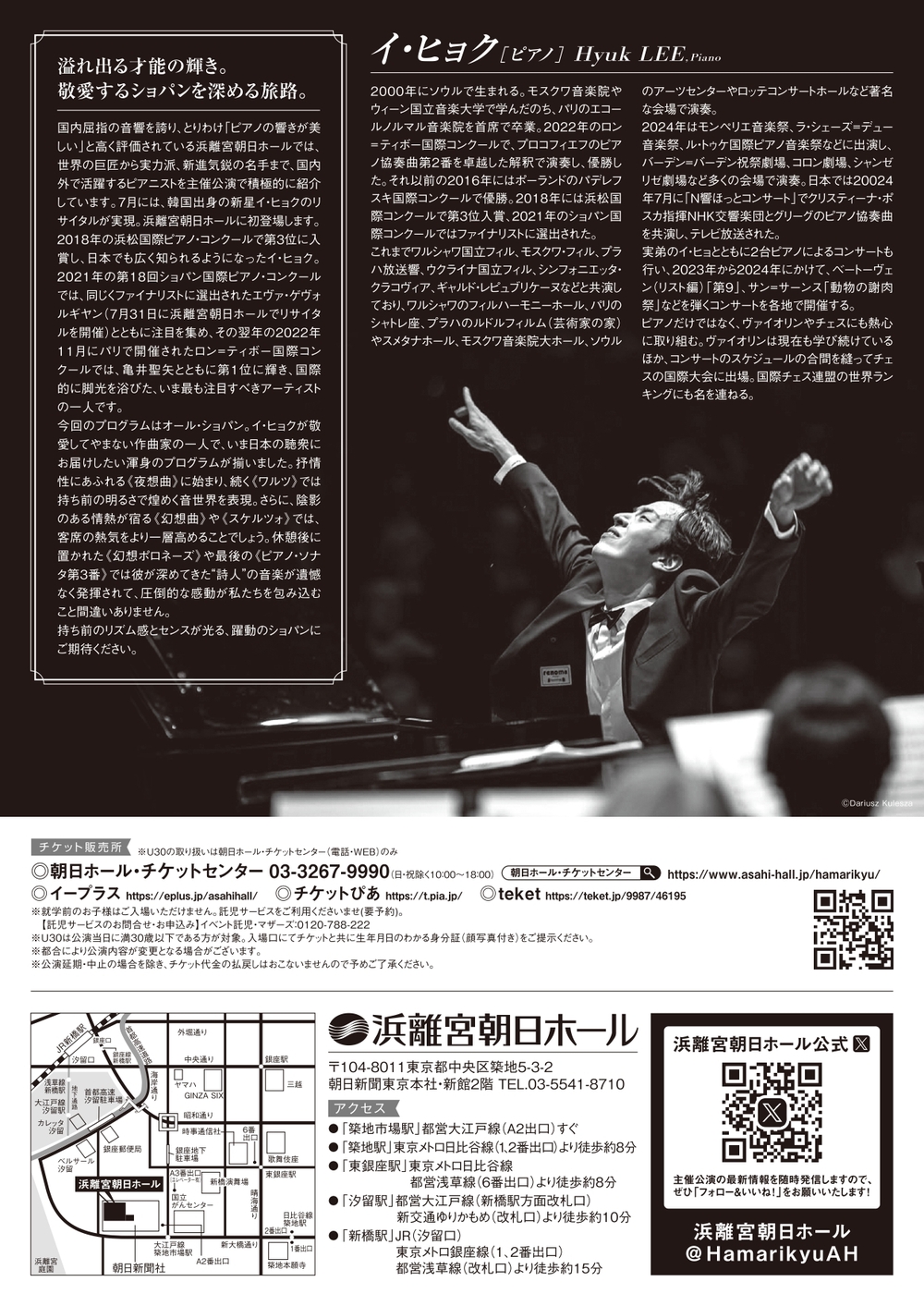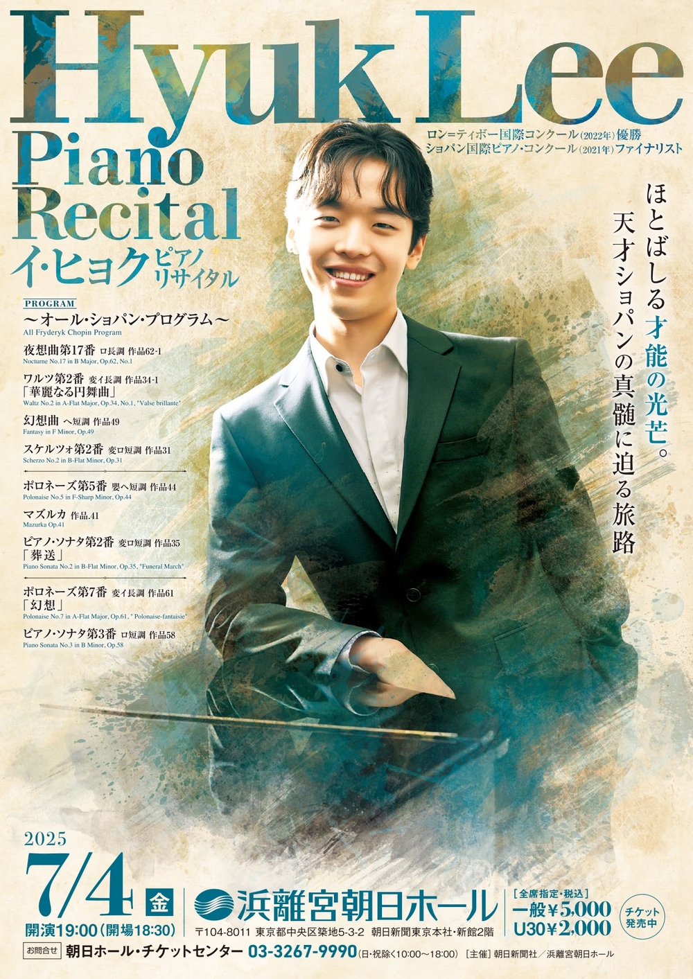 今回はオール・ショパン・プログラムを披露します。イ・ヒョクが敬愛してやまない作曲家の一人で、いま日本のお客様にお届けしたい、こだわりのプログラムが揃いました。天才ショパンの真髄に迫る旅路。持ち前のリズム感とセンスが光る、躍動のピアニズムにご期待ください。