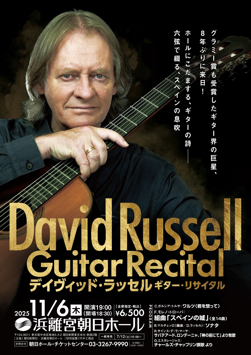 ギター界の巨星、デイヴィッド・ラッセルが8年ぶりに来日!過去にはグラミー賞を獲得するなど、半世紀以上にわたって活躍を続ける"生きる伝説ギタリスト"です。