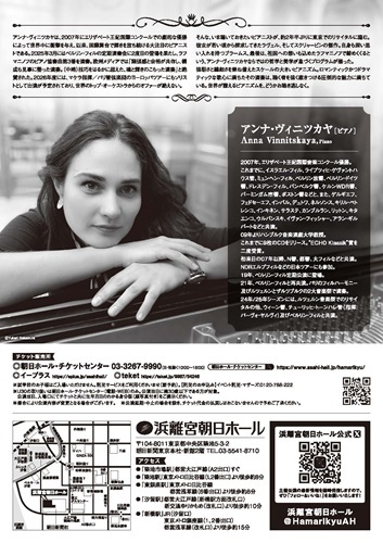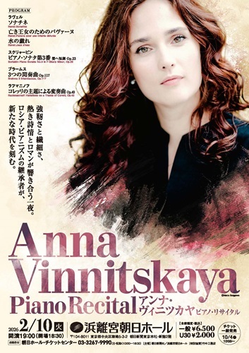 2007年、エリザベート王妃国際コンクールでの劇的な優勝によって世界に衝撃を与えて以来、国際舞台で輝きを放ち続けるアンナ・ヴィニツカヤが、満を持して浜離宮朝日ホールに登場!ベルリン・フィルやパリ管をはじめ、世界のトップ・オーケストラからオファーが絶えない、「いま聴いておきたい」ピアニストのひとりです。