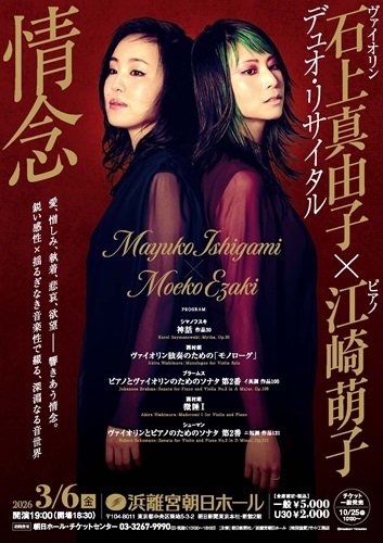 今回は「情念」をテーマに、ロマン派の巨匠たちが遺した傑作や、日本が誇る現代作曲家・西村朗の作品などを織り交ぜた、渾身のプログラムをお届けします。一音一音に情熱と知性を宿し、独自の音楽世界を築き上げる石上真由子×江崎萌子の熱演にご期待ください。
