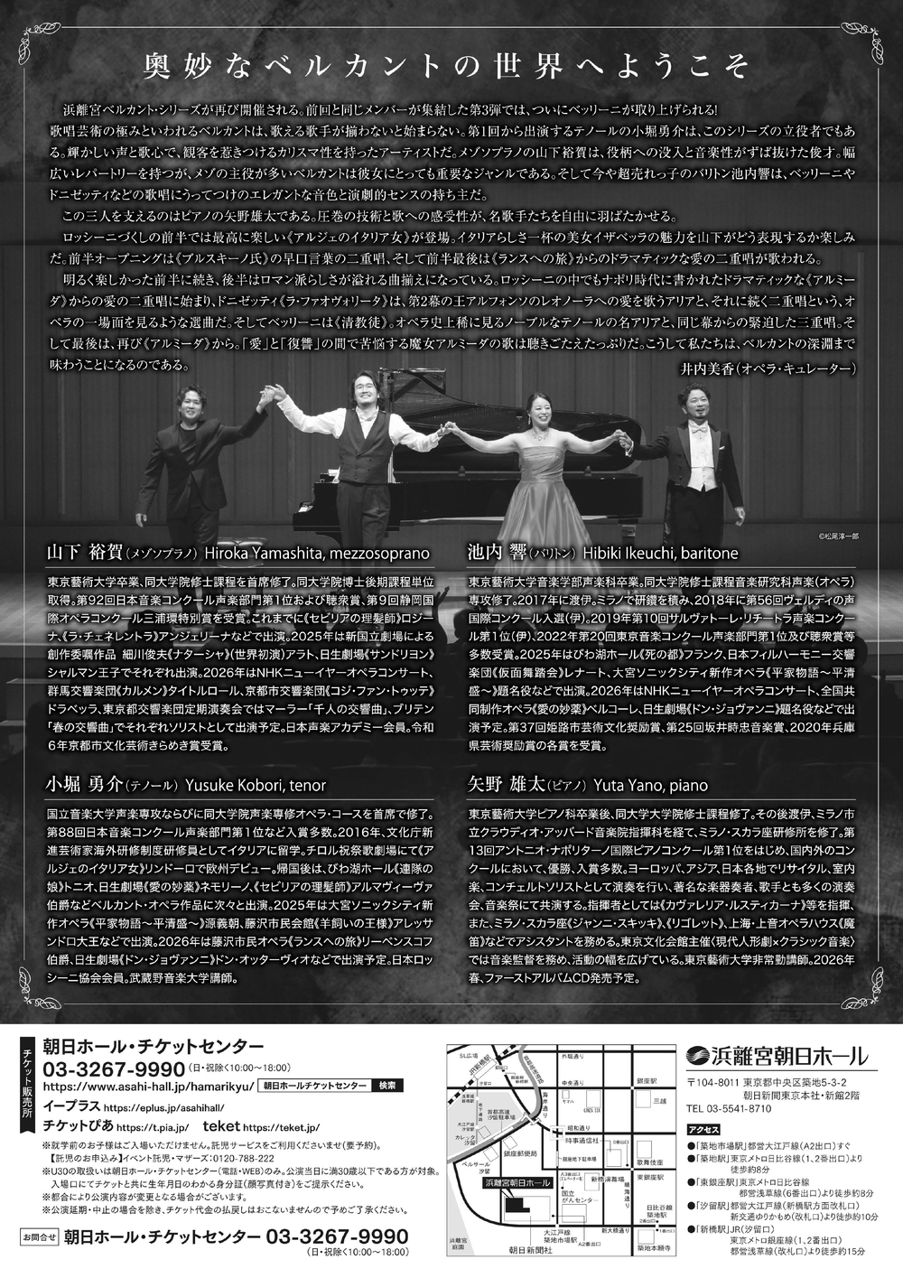 山下裕賀(メゾソプラノ)、小堀勇介(テノール)、池内 響(バリトン)、矢野雄太(ピアノ)