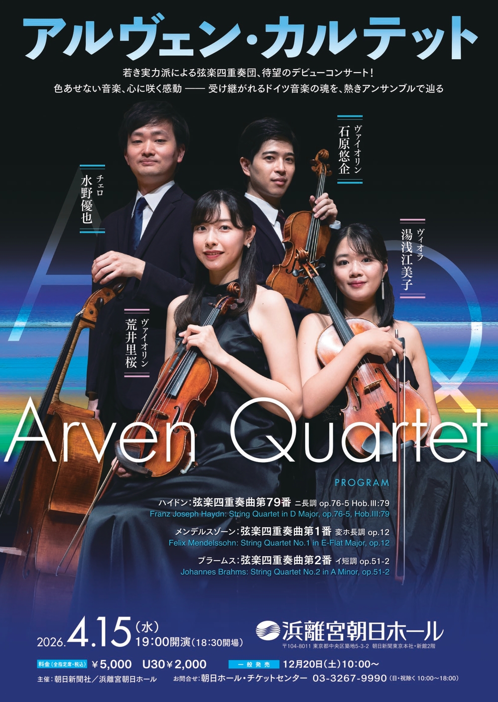 次代を担う若き名手たちによる弦楽四重奏団《Arven Quartet》を結成。デビューコンサートを開催します!色あせることのない音楽、心に咲く感動。受け継がれるドイツ音楽の魂を、渾身のアンサンブルで描き出します。