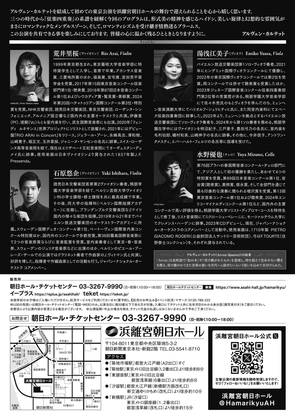 ハチャトゥリアン国際コンクール(2024年)第3位受賞などを誇り、国内外で活躍を続ける荒井里桜、読売日本交響楽団の首席第2ヴァイオリン奏者として、また室内楽奏者として幅広い活動を展開する石原悠企、バイエルン放送交響楽団の第1ソロ・ヴィオラ奏者として、世界を舞台にその存在感を示す湯浅江美子、プラハの春国際音楽コンクール・チェロ部門(2025年)で優勝し、いまもなお注目を集める水野優也。