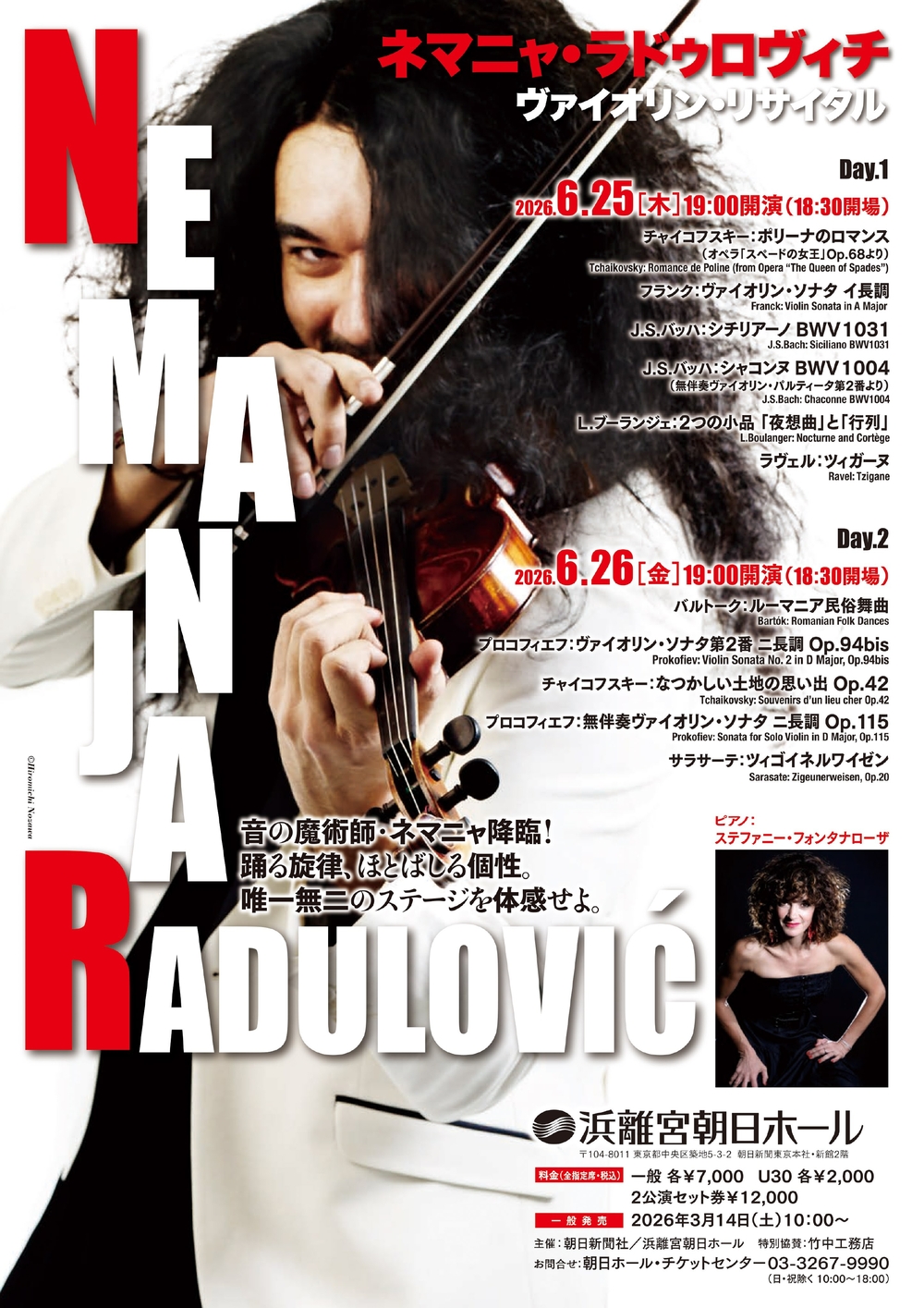 全身からほとばしる圧倒的なオーラとともに、音楽が生き物のようにうねり出す―― 自在なリズム感と鮮烈な音楽性、そして民族的な野性味と洗練さを併せ持つ表現力で、常に聴衆を魅了する音の魔術師、ネマニャ・ラドゥロヴィチが約8年ぶりに浜離宮朝日ホールに帰ってきます!