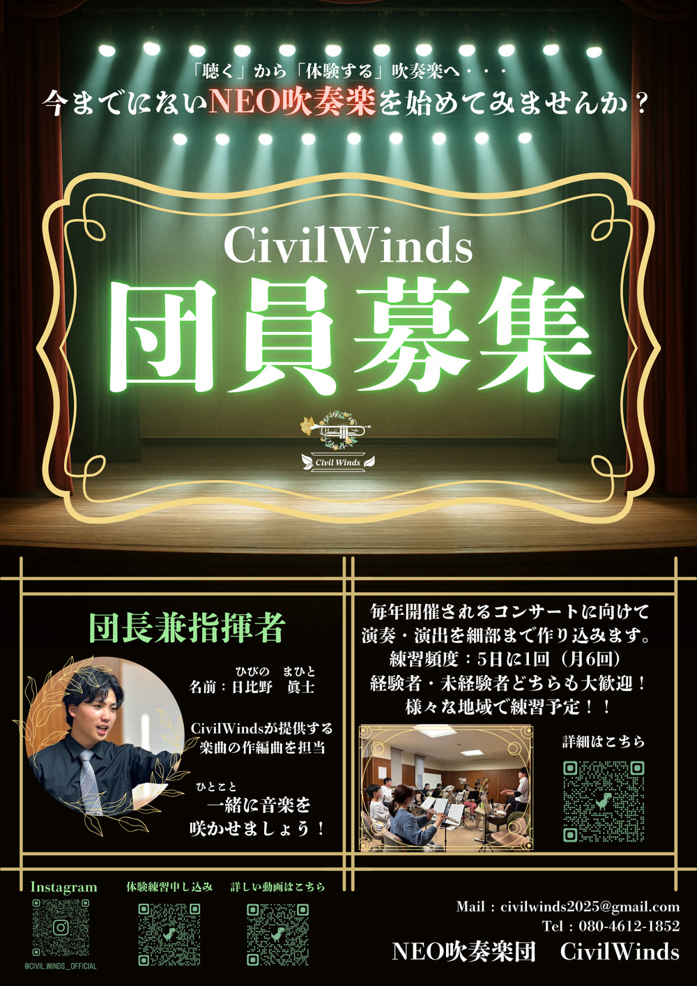 『NEO吹奏楽』とは、CivilWinds独自の「原曲を吹奏楽で再現する」という編曲方法を用いた楽曲を、演奏会などでゲストに「体験していただく」という吹奏楽のことを指します。聴くのではなく体験する、です。オンライン配信などでも楽しんでいただけるよう、演出や技術に力を入れて活動を行っています。