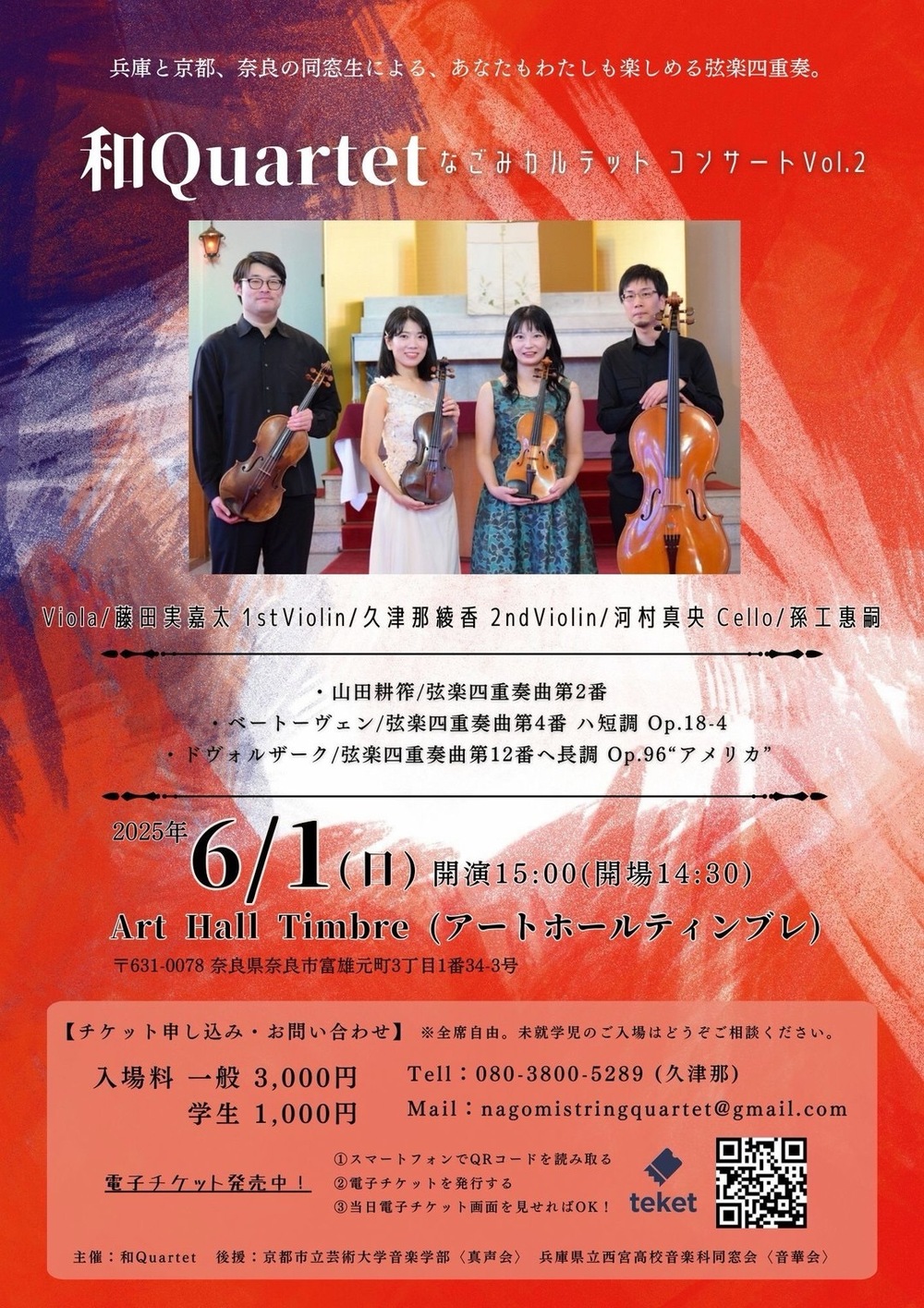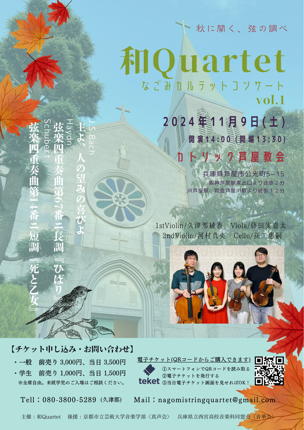 弦楽四重奏を通じて、私たちや聴いてくださる方たちが音楽で和める場所を作りたい。そして弦楽器の生演奏をより身近に親しんで欲しい。そんな想いで、関西を中心に活動している兵庫と奈良、京都出身の同窓メンバーにより2024年に結成。