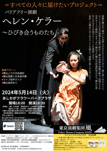 バリアフリー演劇『ヘレン・ケラー 〜ひびき合うものたち』を観る会は足利市で初の公演を皆様にお届けしたいという強い思いで結成した会です。若い世代とシニア世代の割合が半々で構成されており、文化を次の世代に繋ぐ架け橋となる団体となっております。