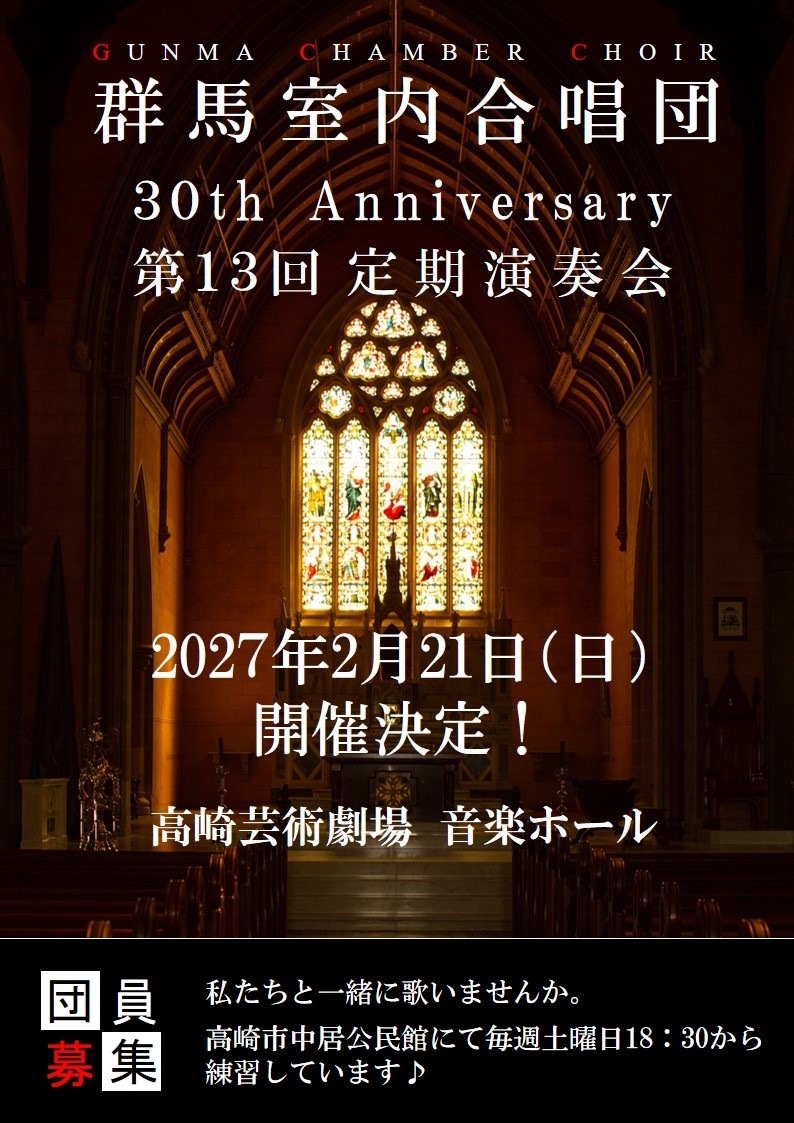 群馬室内合唱団(GCC)は 「ルネッサンスのアカペラ合唱曲を 透明な美しいハーモニーで歌いたい」との想いを共有する人たちにより、故 島田和昭先生(2012年2月ご逝去)の元で1996年に設立された合唱団です。2001年8月にはスイス演奏旅行(ルツェルン市)を行い、また2012年2月には東京都合唱連盟主催「春のコーラスコンテスト2012」の 一般の部に参加してクラシック・現代音楽部門の混声部門にて賞を頂きました。2015年1月からは東京混声合唱団テノールの千葉弘樹先生を常任指揮者にお迎えして、ご指導頂いております。