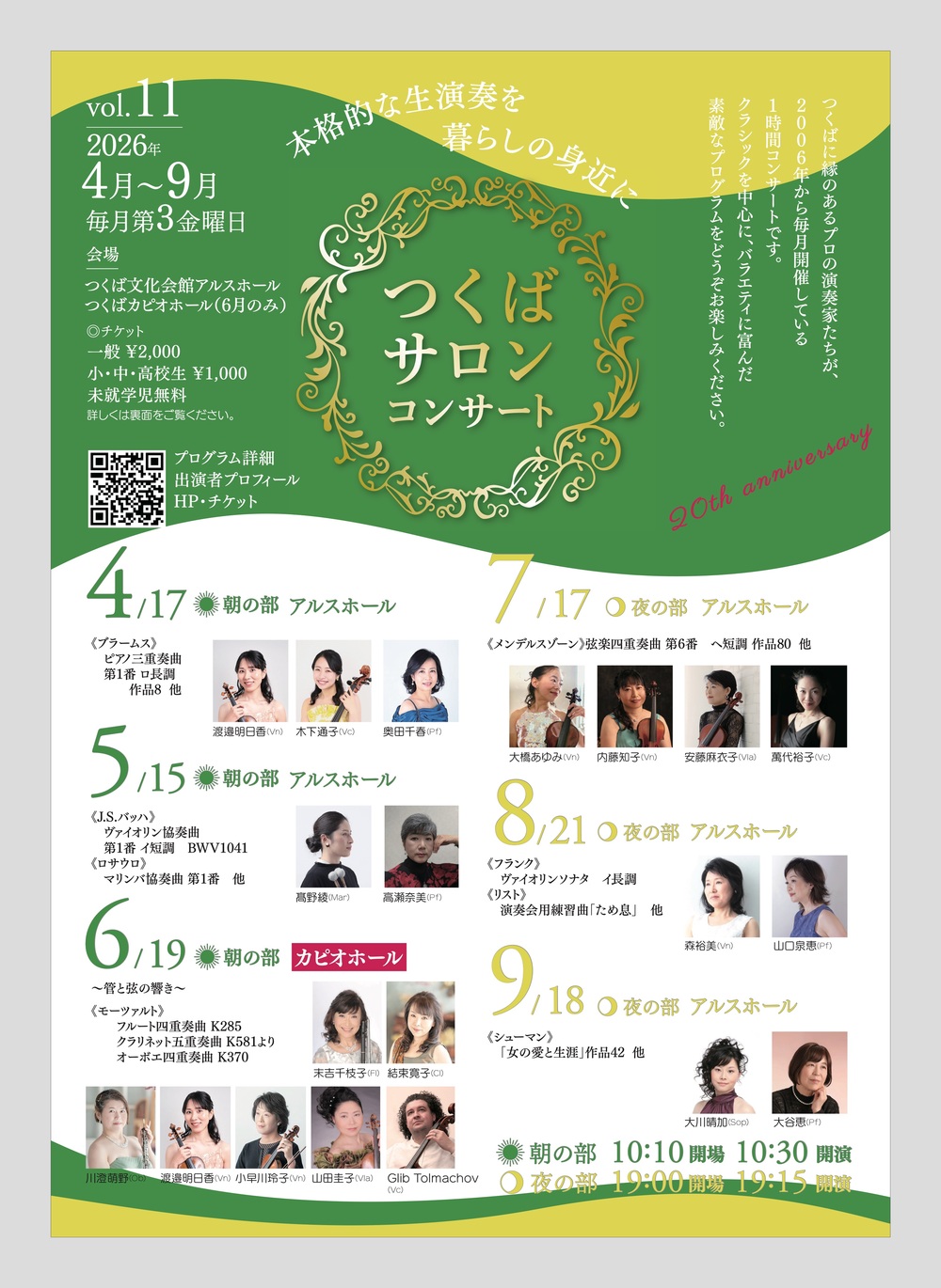 つくばに縁のあるプロの演奏家たちが、2006年から毎月開催している一時間のコンサートです。