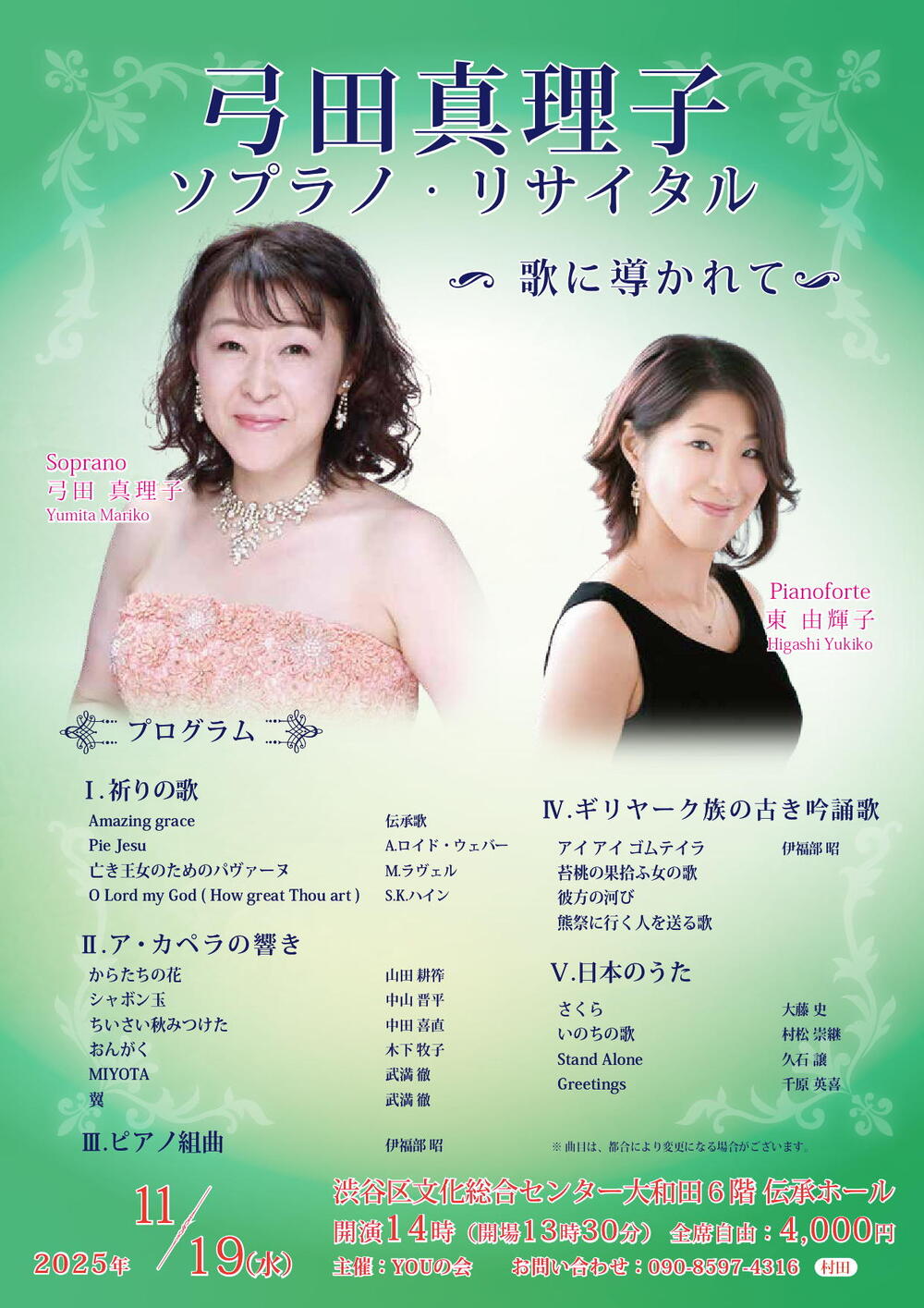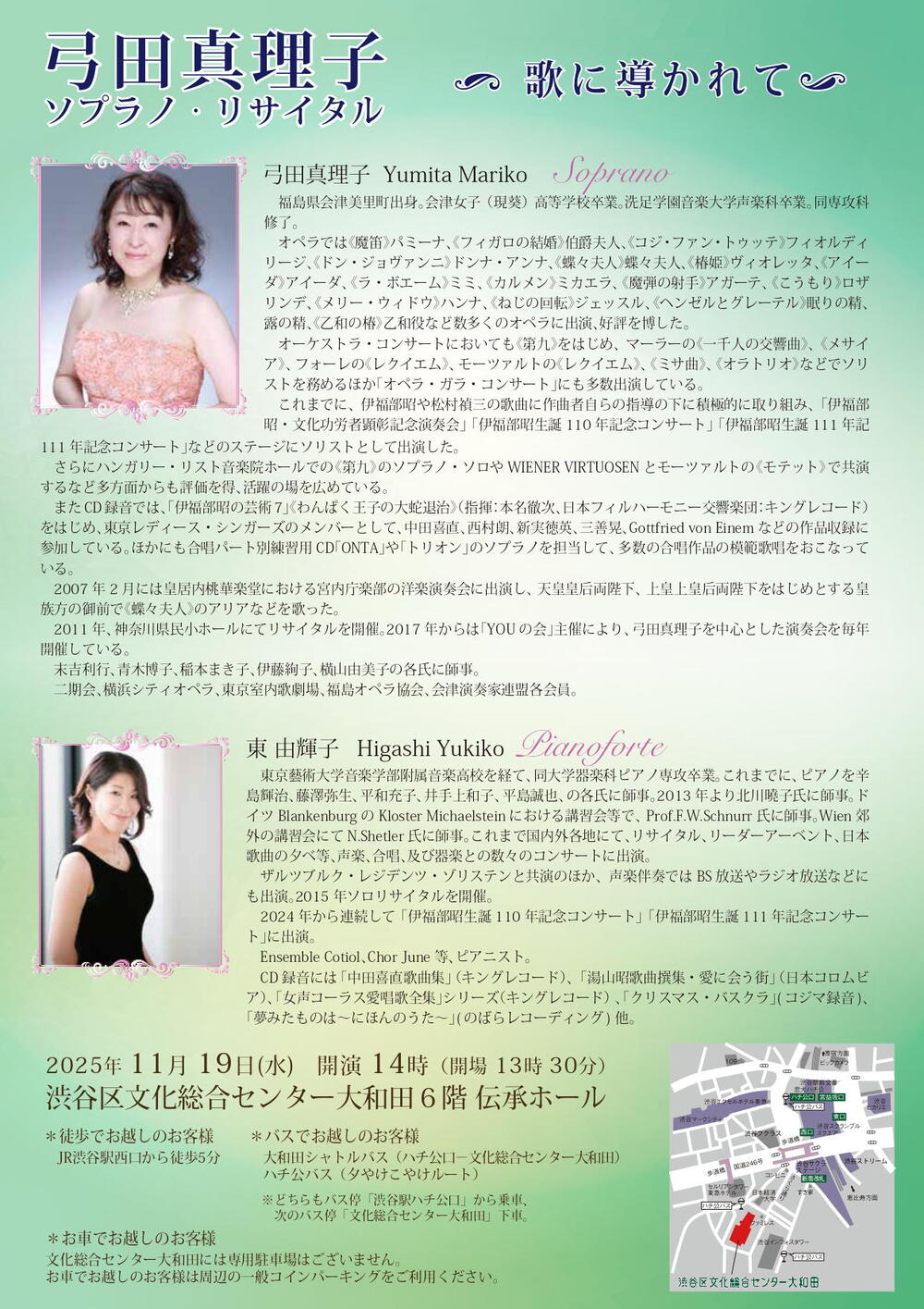 ア・カペラの響き: 弓田真理子さんの声の魅力を堪能できる、挑戦的なア・カペラ・ステージ。山田耕筰、中山晋平、武満徹など、弓田さんの声だけでお届けします。ヴィブラートの少ない透明感のある弓田さんの歌声は、聴く人の心をゆったりと安らぐ気持ちにしてくれます。