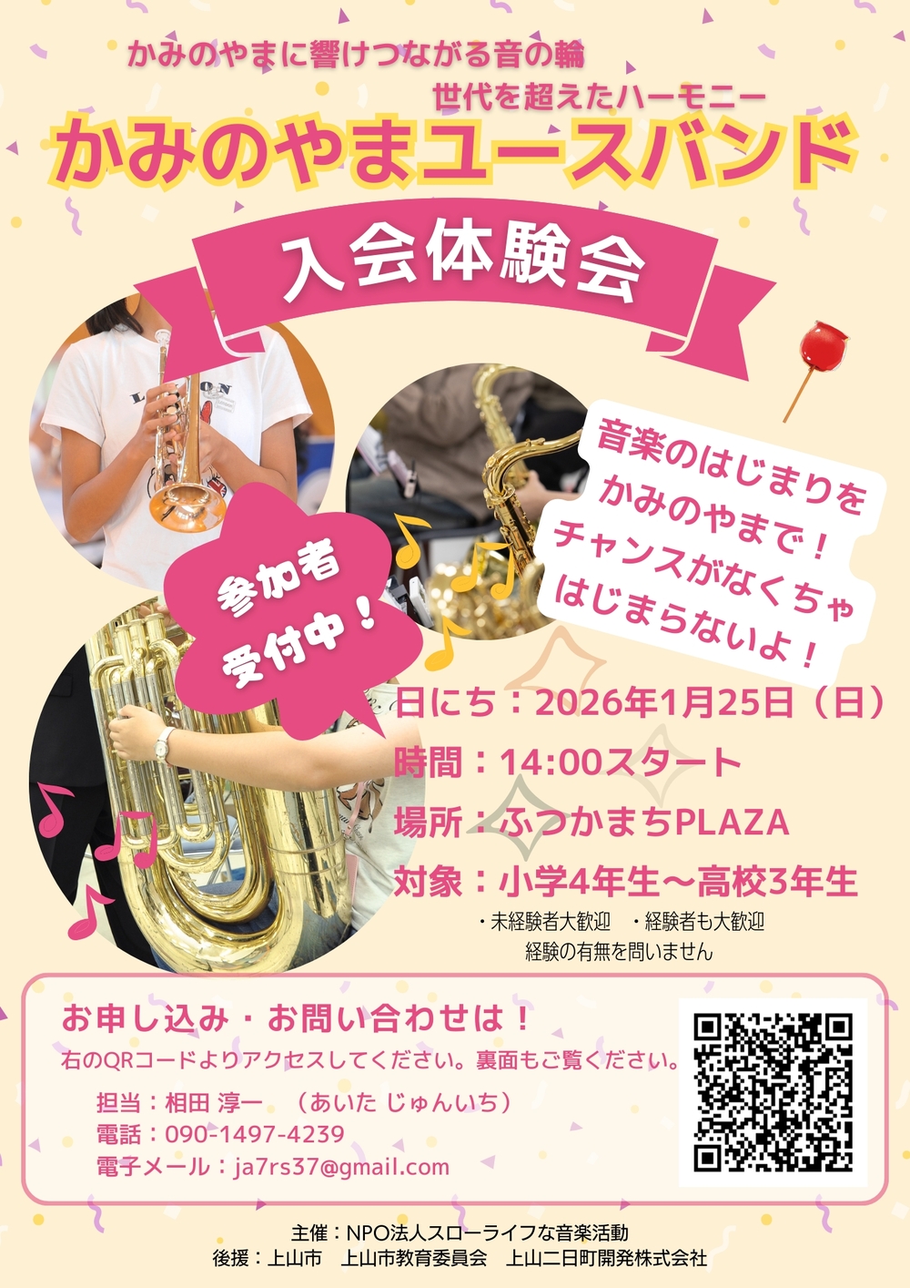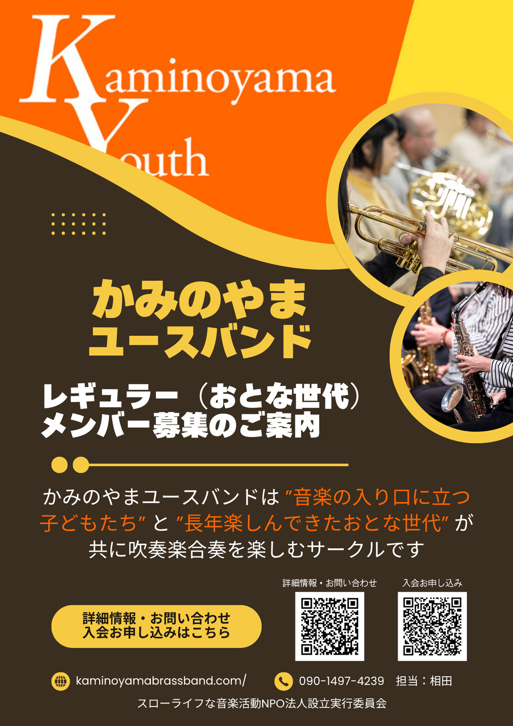元吹奏楽部員が再び音を奏でる「スローライフブラス」、子どもと大人がともに学ぶ「かみのやまユースバンド」、そして英国式金管文化を伝える「パステルブラスバンド」。